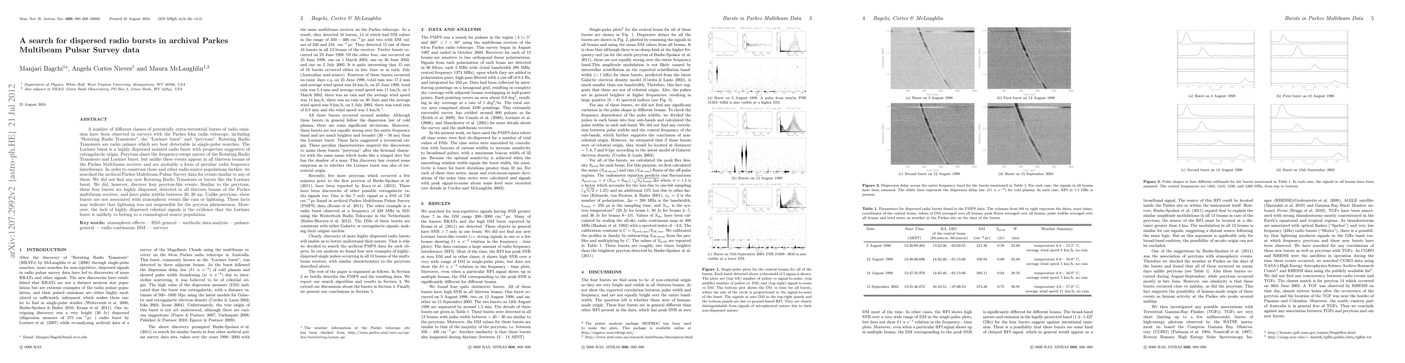 This paper reports a search for dispersed radio bursts in archival data from the Parkes Multibeam Pulsar Survey, focusing on Rotating Radio Transients, the Lorimer burst, and perytons. The study found no new transients or similar to the Lorimer burst but discovered four peryton-like events, suggesting lightning may not be the cause of perytons.