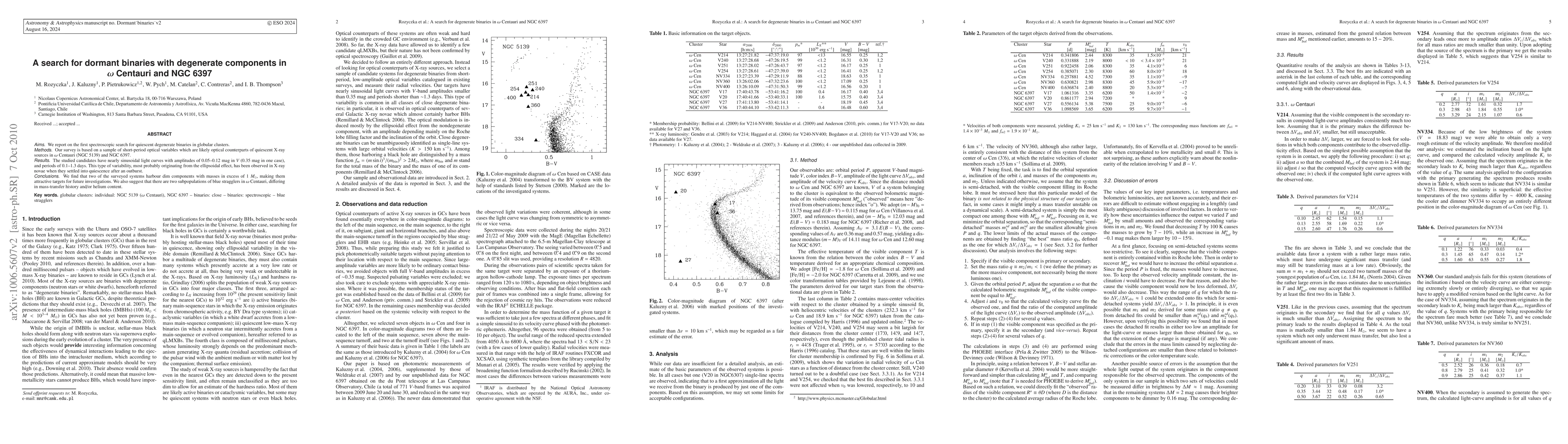 We report on the first spectroscopic search for quiescent degenerate binaries in globular clusters. Our survey is based on a sample of short-period optical variables which are likely optical counterparts of quiescent X-ray sources in omega Centauri (NGC 5139) and NGC 6397. All of the studied candidates have nearly sinusoidal light curves with amplitudes of 0.1--0.35~mag in $V$ and periods of 0.1--1.3~days. This type of variability, most probably originating from the ellipsoidal effect, has been observed in several X-ray novae when they settled into quiescence after an outburst. We find that two of the surveyed systems harbor dim components with masses in excess of one solar masss, making them attractive targets for future investigations. We also suggest that there are two subpopulations of blue stragglers in omega Centauri, differing in mass-transfer history and/or helium content.