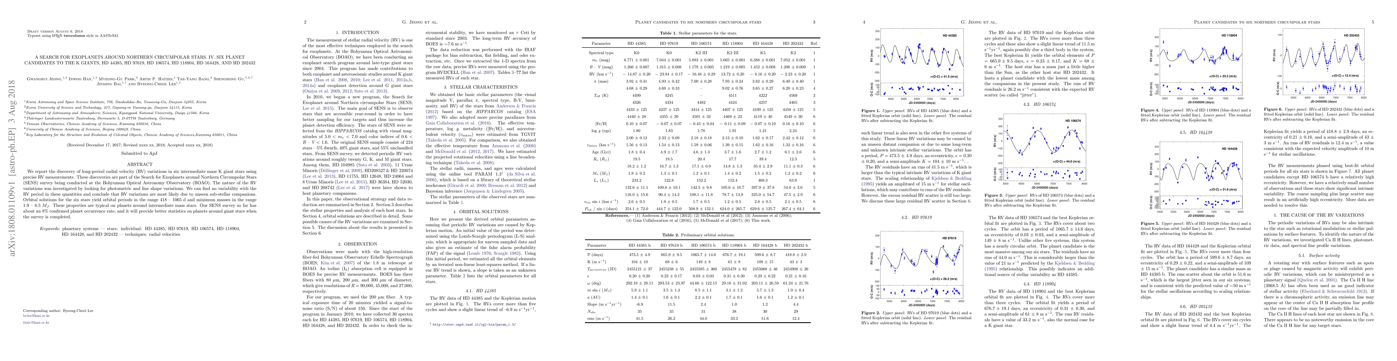 We report the discovery of long-period radial velocity (RV) variations in six intermediate-mass K-giant stars using precise RV measurements. These discoveries are part of the Search for Exoplanets around Northern Circumpolar Stars (SENS) survey being conducted at the Bohyunsan Optical Astronomy Observatory. The nature of the RV variations was investigated by looking for photometric and line shape variations. We can find no variability with the RV period in these quantities and conclude that RV variations are most likely due to unseen sub-stellar companions. Orbital solutions for the six stars yield orbital periods in the range 418-1065 days and minimum masses in the range 1.9-8.5 MJ. These properties are typical on planets around intermediate-mass stars. Our SENS survey so far has about an 8% confirmed planet occurrence rate, and it will provide better statistics on planets around giant stars when the survey is completed.
