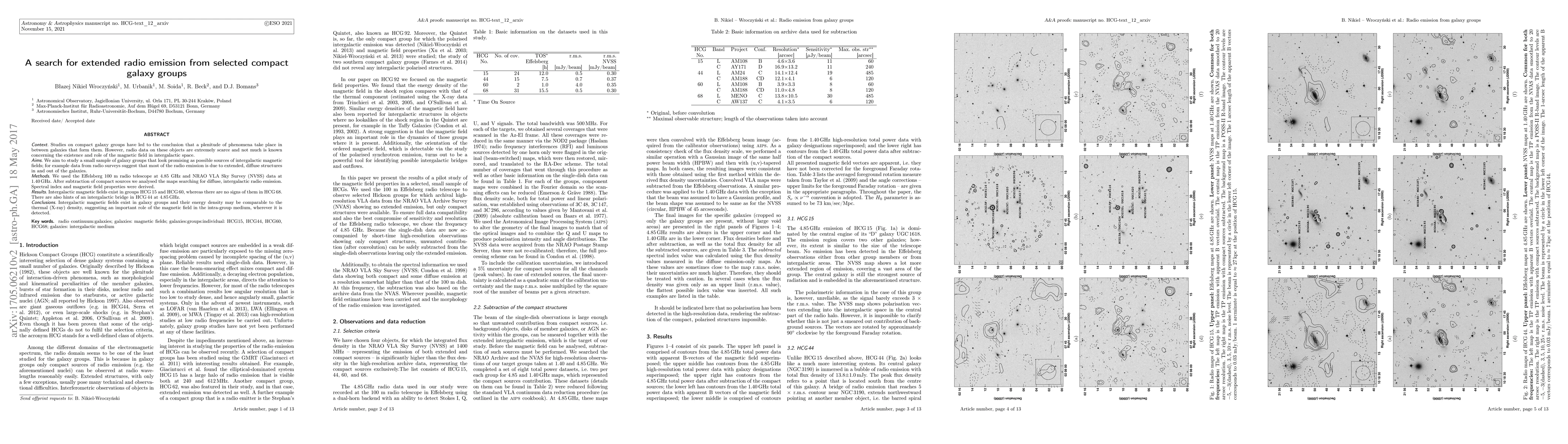 Context. Studies on compact galaxy groups have led to the conclusion that a plenitude of phenomena take place in between galaxies that form them. However, radio data on these objects are extremely scarce and not much is known concerning the existence and role of the magnetic field in intergalactic space. Aims. We aim to study a small sample of galaxy groups that look promising as possible sources of intergalactic magnetic fields; for example data from radio surveys suggest that most of the radio emission is due to extended, diffuse structures in and out of the galaxies. Methods. We used the Effelsberg 100 m radio telescope at 4.85 GHz and NRAO VLA Sky Survey (NVSS) data at 1.40 GHz. After subtraction of compact sources we analysed the maps searching for diffuse, intergalactic radio emission. Spectral index and magnetic field properties were derived. Results. Intergalactic magnetic fields exist in groups HCG 15 and HCG 60, whereas there are no signs of them in HCG 68. There are also hints of an intergalactic bridge in HCG 44 at 4.85 GHz. Conclusions. Intergalactic magnetic fields exist in galaxy groups and their energy density may be comparable to the thermal (X-ray) density, suggesting an important role of the magnetic field in the intra-group medium, wherever it is detected.