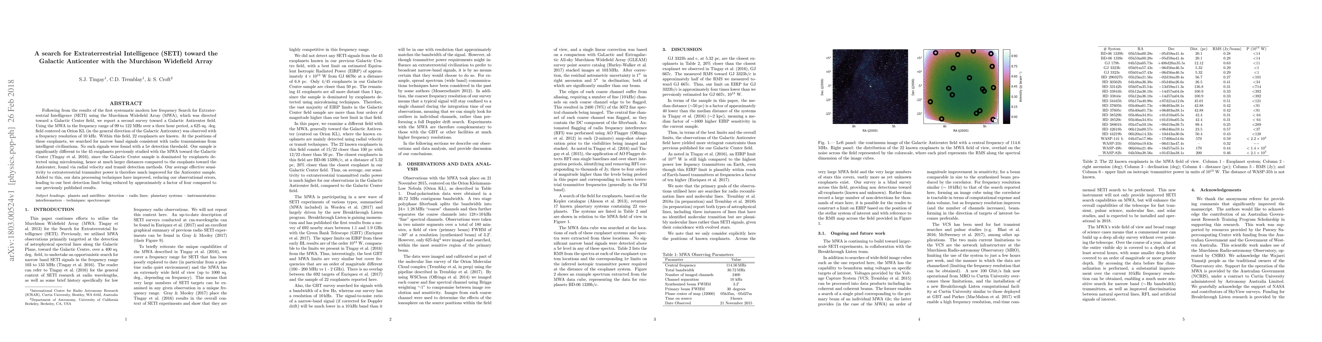This paper reports a SETI survey using the Murchison Widefield Array toward a Galactic Anticenter field, centered on Orion KL, detecting no signals from 22 known exoplanets. The improved sensitivity and data processing techniques resulted in a four-fold better detection limit compared to previous Galactic Center surveys.