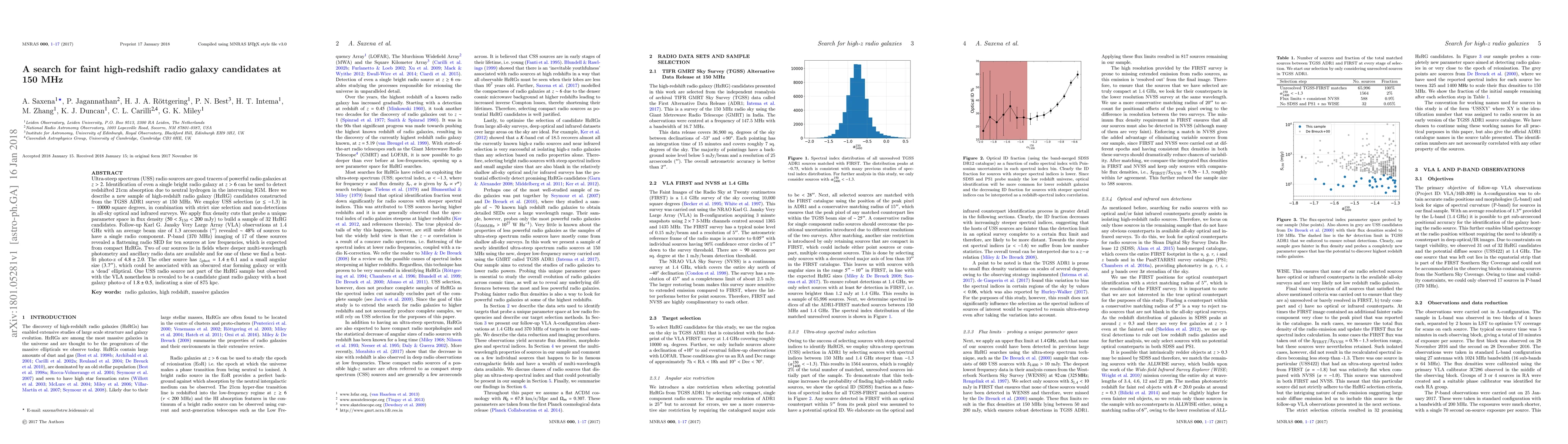 Ultra-steep spectrum (USS) radio sources are good tracers of powerful radio galaxies at $z > 2$. Identification of even a single bright radio galaxy at $z > 6$ can be used to detect redshifted 21cm absorption due to neutral hydrogen in the intervening IGM. Here we describe a new sample of high-redshift radio galaxy (HzRG) candidates constructed from the TGSS ADR1 survey at 150 MHz. We employ USS selection ($\alpha \le -1.3$) in $\sim10000$ square degrees, in combination with strict size selection and non-detections in all-sky optical and infrared surveys. We apply flux density cuts that probe a unique parameter space in flux density ($50 < S_{\textrm{150}} < 200$ mJy) to build a sample of 32 HzRG candidates. Follow-up Karl G. Jansky Very Large Array (VLA) observations at 1.4 GHz with an average beam size of $1.3$ arcseconds ($"$) revealed $\sim 48\%$ of sources to have a single radio component. P-band (370 MHz) imaging of 17 of these sources revealed a flattening radio SED for ten sources at low frequencies, which is expected from compact HzRGs. Two of our sources lie in fields where deeper multi-wavelength photometry and ancillary radio data are available and for one of these we find a best-fit photo-z of $4.8 \pm 2.0$. The other source has $z_{\textrm{phot}}=1.4 \pm 0.1$ and a small angular size ($3.7"$), which could be associated with an obscured star forming galaxy or with a "dead" elliptical. One USS radio source not part of the HzRG sample but observed with the VLA nonetheless is revealed to be a candidate giant radio galaxy with a host galaxy photo-z of $1.8\pm0.5$, indicating a size of 875 kpc.