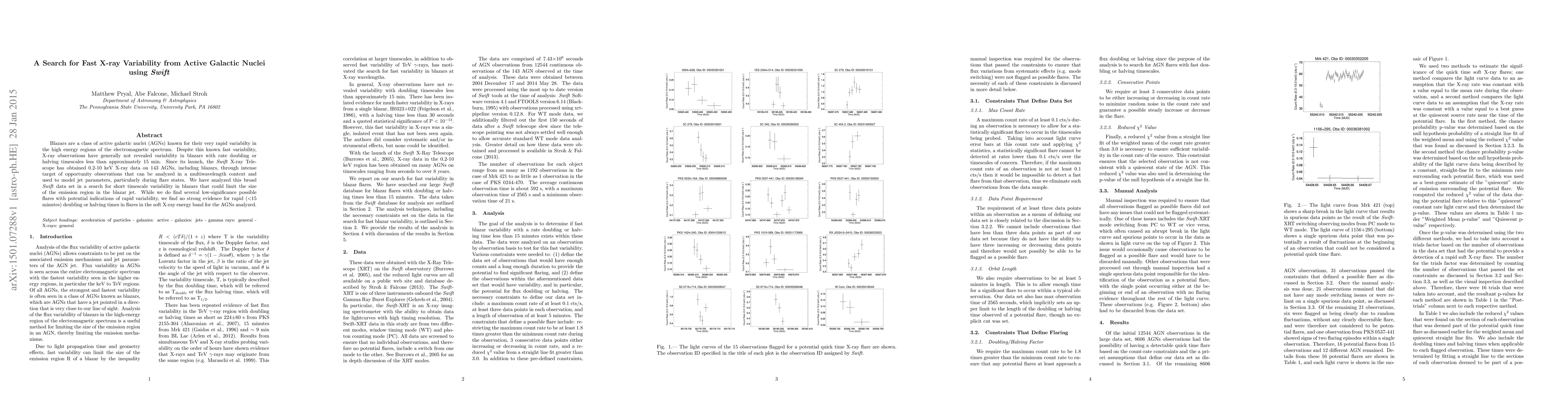 Blazars are a class of active galactic nuclei (AGNs) known for their very rapid variabilty in the high energy regions of the electromagnetic spectrum. Despite this known fast variability, X-ray observations have generally not revealed variability in blazars with rate doubling or halving timescales less than approximately 15 min. Since its launch, the Swift X-ray Telescope has obtained 0.2-10 keV X-ray data on 143 AGNs, including blazars, through intense target of opportunity observations that can be analyzed in a multiwavelength context and used to model jet parameters, particularly during flare states. We have analyzed this broad Swift data set in a search for short timescale variability in blazars that could limit the size of the emission region in the blazar jet. While we do find several low-significance possible flares with potential indications of rapid variability, we find no strong evidence for rapid ($<$15 minutes) doubling or halving times in flares in the soft X-ray energy band for the AGNs analyzed.