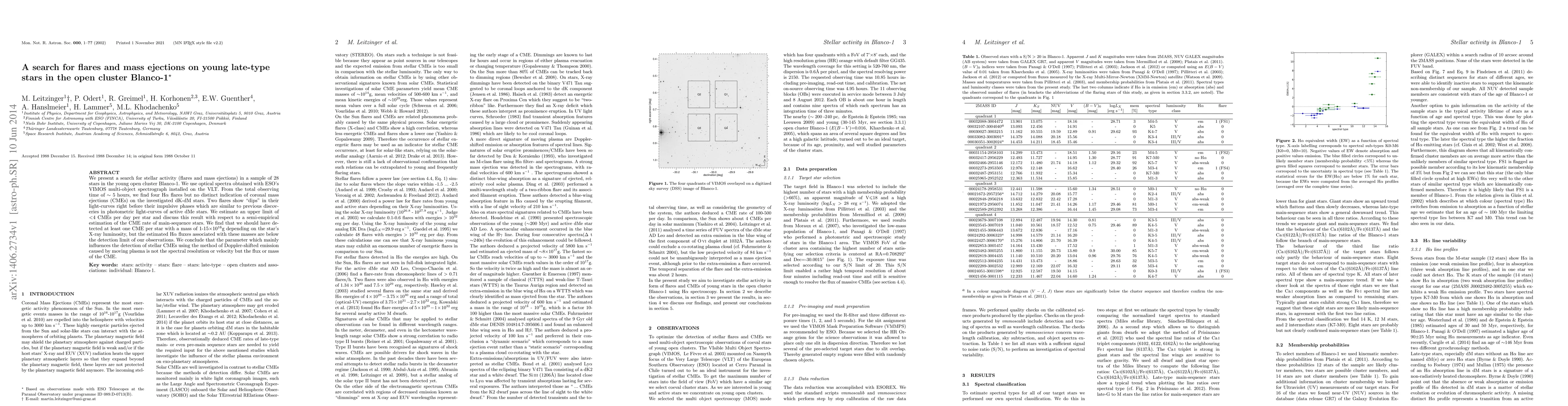 We present a search for stellar activity (flares and mass ejections) in a sample of 28 stars in the young open cluster Blanco-1. We use optical spectra obtained with ESO's VIMOS multi-object spectrograph installed on the VLT. From the total observing time of $\sim$ 5 hours, we find four H$\alpha$ flares but no distinct indication of coronal mass ejections (CMEs) on the investigated dK-dM stars. Two flares show "dips" in their light-curves right before their impulsive phases which are similar to previous discoveries in photometric light-curves of active dMe stars. We estimate an upper limit of $<$4 CMEs per day per star and discuss this result with respect to a semi- empirical estimation of the CME rate of main-sequence stars. We find that we should have detected at least one CME per star with a mass of 1-15$\times10^{16}$ g depending on the star's X-ray luminosity, but the estimated H$\alpha$ fluxes associated with these masses are below the detection limit of our observations. We conclude that the parameter which mainly influences the detection of stellar CMEs using the method of Doppler-shifted emission caused by moving plasma is not the spectral resolution or velocity but the flux or mass of the CME.
