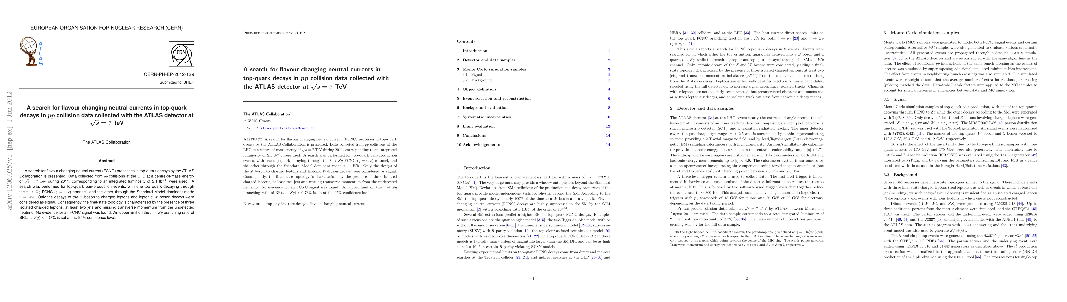 The ATLAS Collaboration searched for flavour changing neutral currents in top-quark decays using 2011 LHC data at 7 TeV, finding no evidence for such processes. An upper limit of 0.73% at 95% confidence level was set on the t->Zq branching ratio.