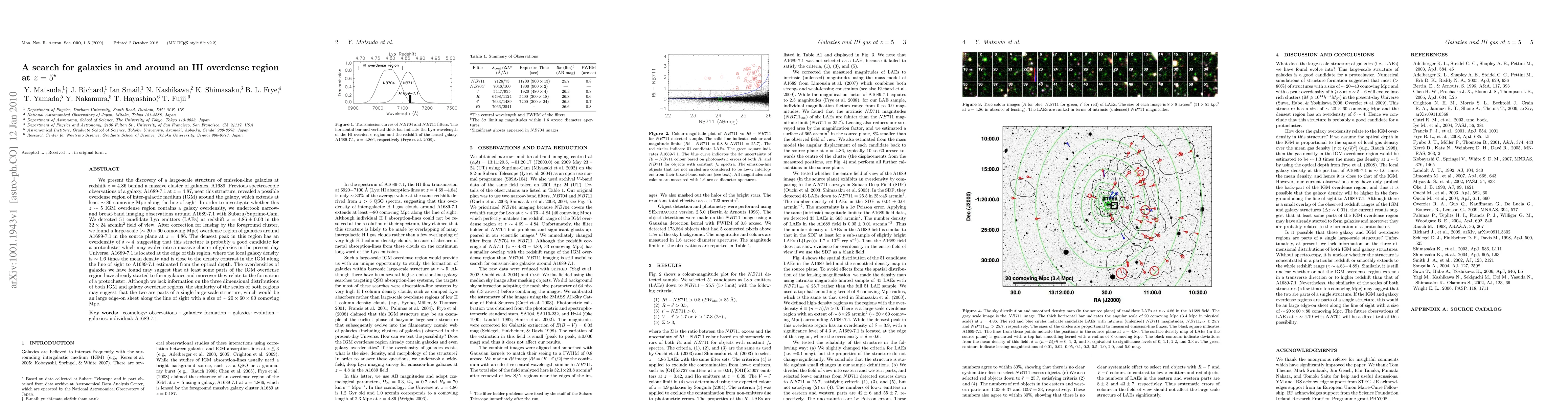 This research identifies a large-scale structure of emission-line galaxies at redshift z=4.86, possibly forming a protocluster, behind a massive cluster A1689. Utilizing Subaru/Suprime-Cam, they detected 51 candidate Ly-alpha emitters, revealing a significant overdense region of galaxies (~20 x 60 comoving Mpc) in the source plane. This overdensity correlates with an earlier-detected IGM overdense region, suggesting that some IGM overdense portions have begun forming galaxies and might constitute part of a larger edge-on sheet structure (~20 x 60 x 80 comoving Mpc).