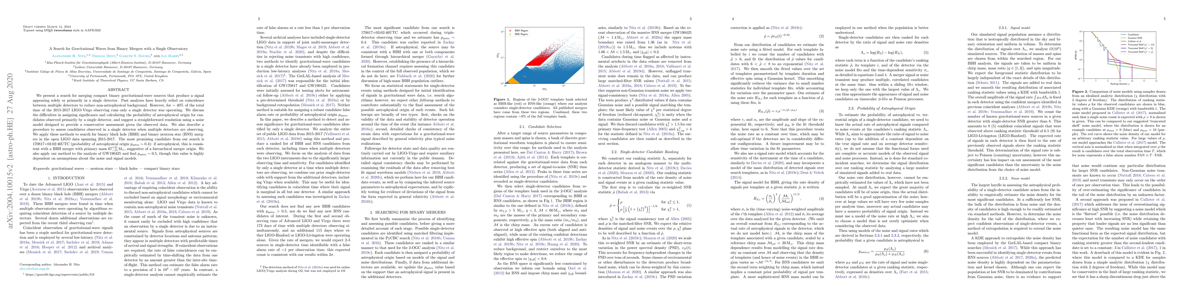 The paper presents a method to detect gravitational waves from binary mergers using a single observatory, addressing the challenge of 40% of observation time when only one detector is operational. Applying this to LIGO data from 2015-2017, they identify a promising candidate, 170817+03:02:46UTC, with a 40% probability of being astrophysical, suggesting a hierarchical binary black hole merger. They also analyze GW190425, finding a 50% probability, contingent on noise and signal model assumptions.