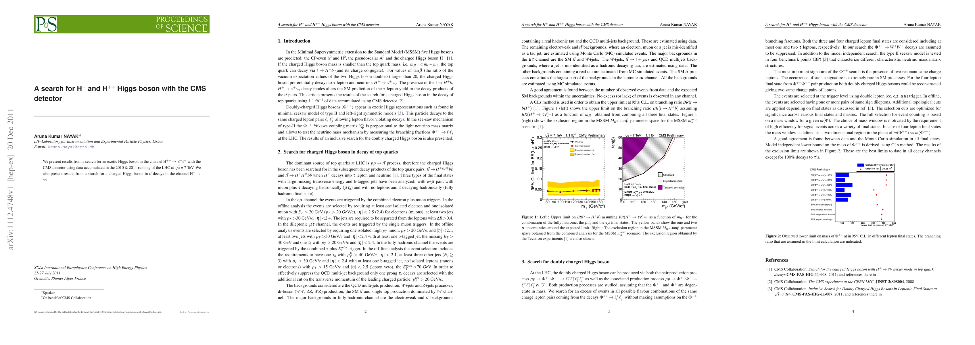 We present results from a search for an exotic Higgs boson in the channel H$^{++}$ $\rightarrow ~\ell^{+}\ell^{+}$ with the CMS detector using data accumulated in the 2010 & 2011 running of the LHC at $\sqrt{s}$ = 7 TeV. We also present results from a search for a charged Higgs boson in $t\bar{t}$ decays in the channel H$^{+}$ $\rightarrow$ $\tau\nu$