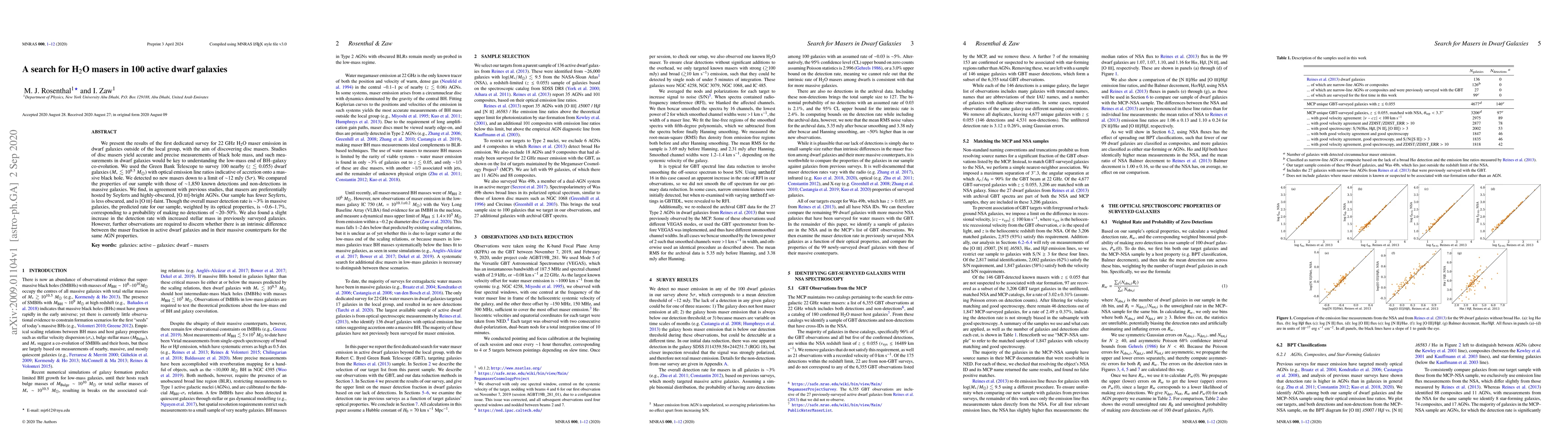 We present the results of the first dedicated survey for 22 GHz H$_2$O maser emission in dwarf galaxies outside of the local group, with the aim of discovering disc masers. Studies of disc masers yield accurate and precise measurements of black hole mass, and such measurements in dwarf galaxies would be key to understanding the low-mass end of BH-galaxy co-evolution. We used the Green Bank Telescope to survey 100 nearby ($z \lesssim 0.055$) dwarf galaxies ($M_* \lesssim 10^{9.5}~M_{\odot}$) with optical emission line ratios indicative of accretion onto a massive black hole. We detected no new masers down to a limit of $\sim$12 mJy (5$\sigma$). We compared the properties of our sample with those of $\sim$1,850 known detections and non-detections in massive galaxies. We find, in agreement with previous studies, that masers are preferentially hosted by Seyferts and highly-obscured, [O III]-bright AGNs. Our sample has fewer Seyferts, is less obscured, and is [O III]-faint. Though the overall maser detection rate is $\sim$3% in massive galaxies, the predicted rate for our sample, weighted by its optical properties, is $\sim$0.6-1.7%, corresponding to a probability of making no detections of $\sim$20-50%. We also found a slight increase in the detection rate with increased stellar mass in previously surveyed galaxies. However, further observations are required to discern whether there is an intrinsic difference between the maser fraction in active dwarf galaxies and in their massive counterparts for the same AGN properties.