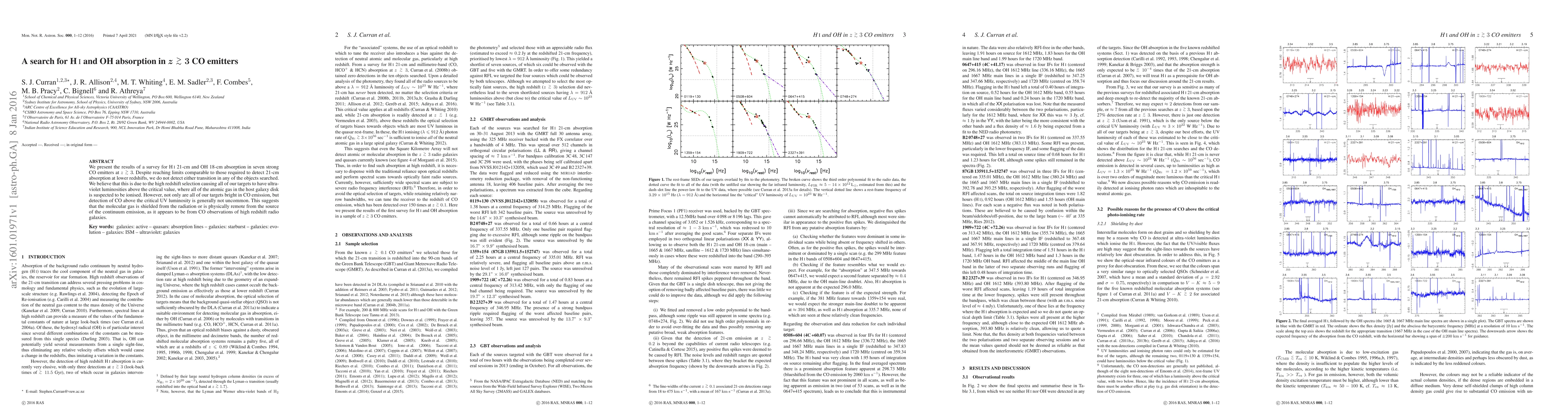 We present the results of a survey for HI 21-cm and OH 18-cm absorption in seven strong CO emitters at z > 3. Despite reaching limits comparable to those required to detect 21-cm absorption at lower redshifts, we do not detect either transition in any of the objects searched. We believe that this is due to the high redshift selection causing all of our targets to have ultra-violet luminosities above the critical value, where all of the atomic gas in the host galaxy disk is suspected to be ionised. However, not only are all of our targets bright in CO emission, but detection of CO above the critical UV luminosity is generally not uncommon. This suggests that the molecular gas is shielded from the radiation or is physically remote from the source of the continuum emission, as it appears to be from CO observations of high redshift radio galaxies.