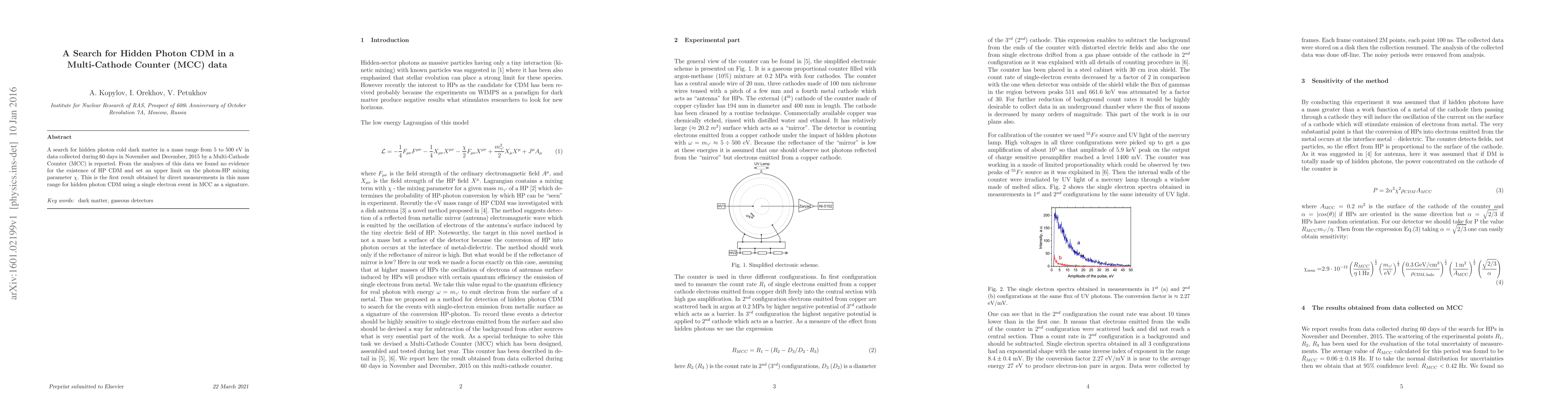 This research reports a search for hidden photon cold dark matter (HP CDM) in a mass range of 5 to 500 eV using a Multi-Cathode Counter (MCC) over 60 days in late 2015. No evidence for HP CDM was found, and an upper limit on the photon-HP mixing parameter $\chi$ was established.