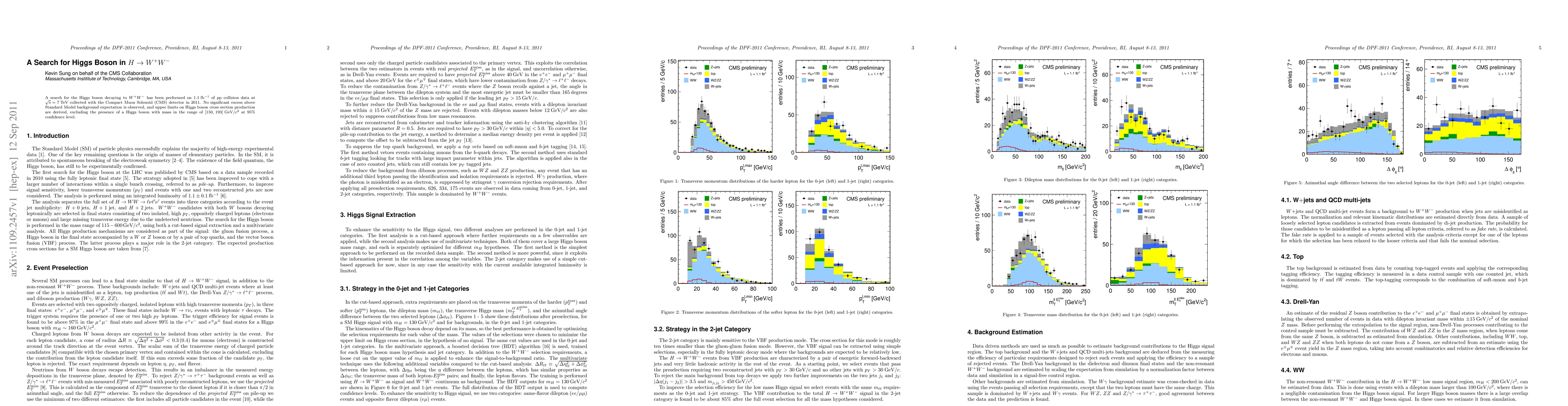 A search for the Higgs boson decaying to $W^+W^-$ has been performed on $1.1\:$fb$^{-1}$ of pp collision data at $\sqrt{s}=7\:$TeV collected with the Compact Muon Solenoid (CMS) detector in 2011. No significant excess above Standard Model background expectation is observed, and upper limits on Higgs boson cross section production are derived, excluding the presence of a Higgs boson with mass in the range of $[150, 193]\:$GeV$/c^{2}$ at 95% confidence level.
