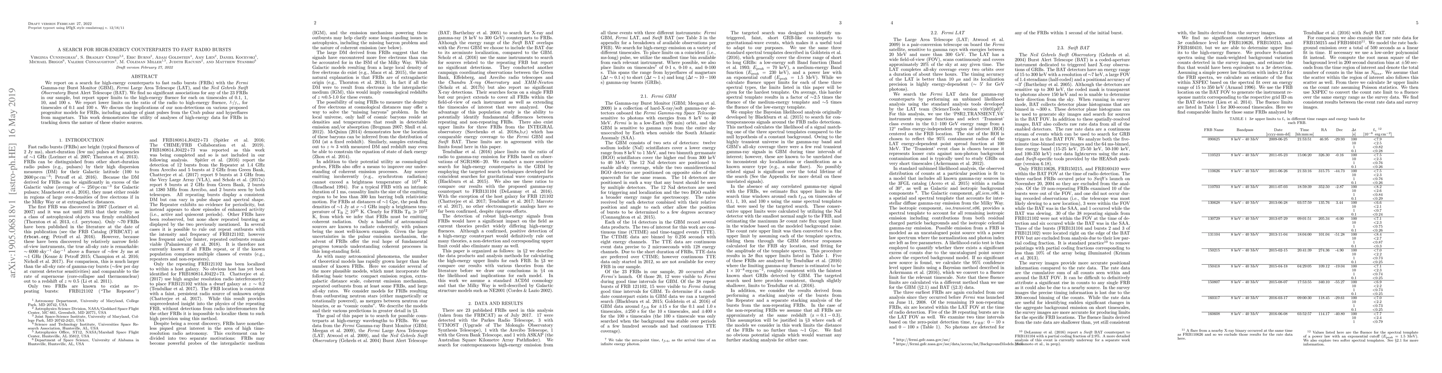 A search for high-energy counterparts to fast radio bursts found no significant associations with Fermi data, but set upper limits on high-energy fluence and radio-to-high-energy flux ratios.