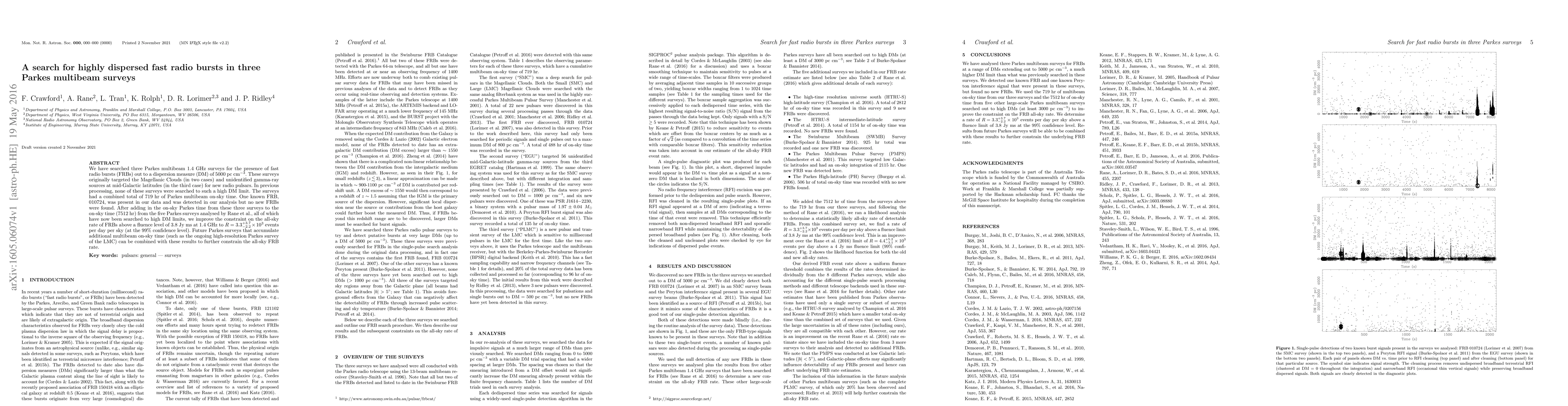 A search for fast radio bursts (FRBs) in three Parkes multibeam surveys revealed one known FRB but no new discoveries, improving the constraint on the all-sky rate of FRBs above a fluence level of 3.8 Jy ms at 1.4 GHz to $R = 3.3^{+3.7}_{-2.2} imes 10^{3}$ events per day per sky.