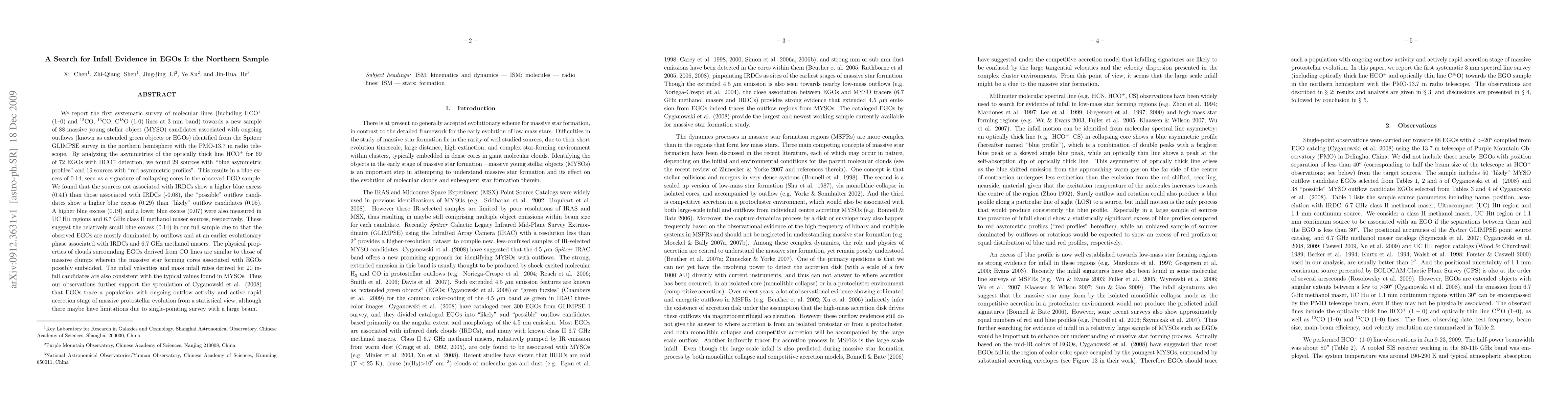 This study systematically surveys molecular lines towards 88 northern EGO candidates, finding 29 sources with blue asymmetric HCO+ profiles indicative of collapsing cores. The relatively small blue excess suggests these EGOs are dominated by outflows and at an early evolutionary phase, supporting the hypothesis that EGOs trace massive protostellar evolution with active accretion.