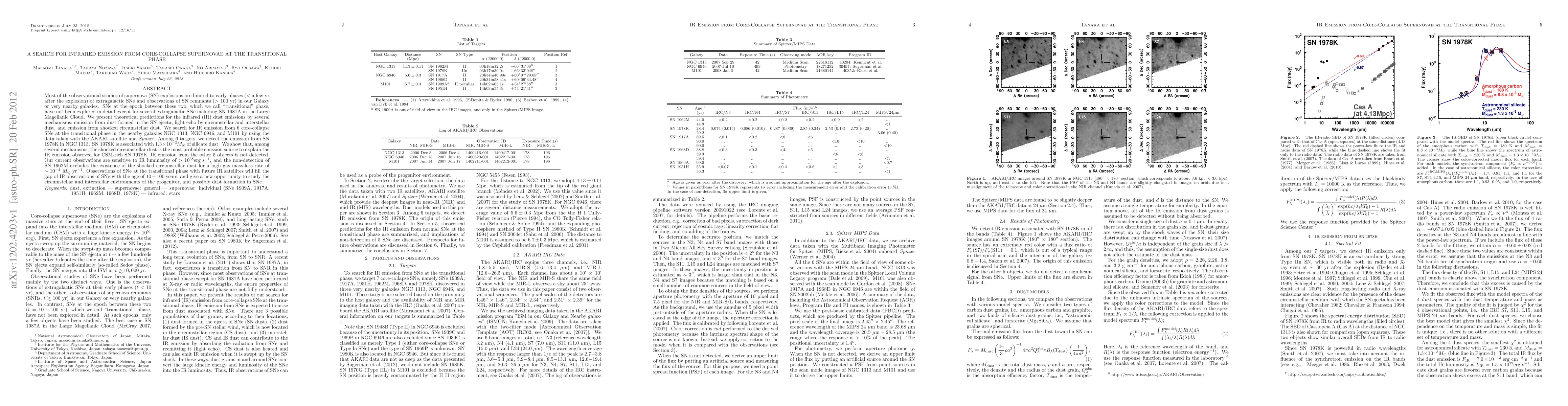 Most of the observational studies of supernova (SN) explosions are limited to early phases (< a few yr after the explosion) of extragalactic SNe and observations of SN remnants (> 100 yr) in our Galaxy or very nearby galaxies. SNe at the epoch between these two, which we call "transitional" phase, have not been explored in detail except for several extragalactic SNe including SN 1987A in the Large Magellanic Cloud. We present theoretical predictions for the infrared (IR) dust emissions by several mechanisms; emission from dust formed in the SN ejecta, light echo by circumstellar and interstellar dust, and emission from shocked circumstellar dust. We search for IR emission from 6 core-collapse SNe at the transitional phase in the nearby galaxies NGC 1313, NGC 6946, and M101 by using the data taken with the AKARI satellite and Spitzer. Among 6 targets, we detect the emission from SN 1978K in NGC 1313. SN 1978K is associated with 1.3 x 10^{-3} Msun of silicate dust. We show that, among several mechanisms, the shocked circumstellar dust is the most probable emission source to explain the IR emission observed for CSM-rich SN 1978K. IR emission from the other 5 objects is not detected. Our current observations are sensitive to IR luminosity of > 10^{38} erg s^{-1}, and the non-detection of SN 1962M excludes the existence of the shocked circumstellar dust for a high gas mass-loss rate of sim 10^{-4} Msun yr^{-1}. Observations of SNe at the transitional phase with future IR satellites will fill the gap of IR observations of SNe with the age of 10-100 years, and give a new opportunity to study the circumstellar and interstellar environments of the progenitor, and possibly dust formation in SNe.