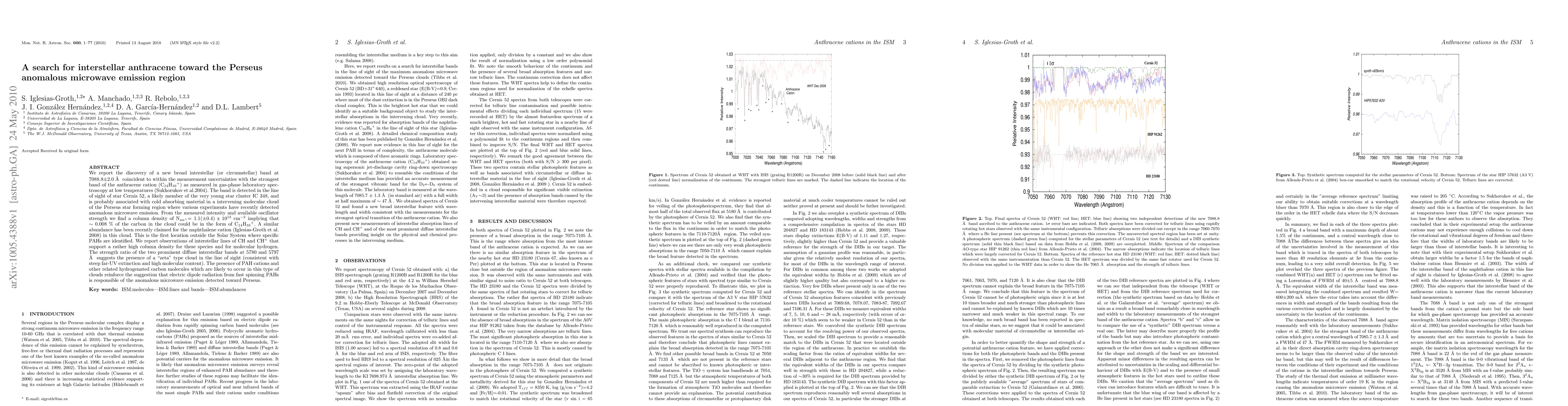 We report the discovery of a new broad interstellar (or circumstellar) band at 7088.8 +- 2.0 \AA coincident to within the measurement uncertainties with the strongest band of the anthracene cation (C$_{14}$H$_{10}$$^+$) as measured in gas-phase laboratory spectroscopy at low temperatures (Sukhorukov et al.2004). The band is detected in the line of sight of star Cernis 52, a likely member of the very young star cluster IC 348, and is probably associated with cold absorbing material in a intervening molecular cloud of the Perseus star forming region where various experiments have recently detected anomalous microwave emission. From the measured intensity and available oscillator strength we find a column density of N$_{an^+}$= 1.1(+-0.4) x 10$^{13}$ cm$^{-2}$ implying that ~0.008% of the carbon in the cloud could be in the form of C$_{14}$H$_{10}$$^+$. A similar abundance has been recently claimed for the naphthalene cation (Iglesias-Groth et al. 2008) in this cloud. This is the first location outside the Solar System where specific PAHs are identified. We report observations of interstellar lines of CH and CH$^+$ that support a rather high column density for these species and for molecular hydrogen. The strength ratio of the two prominent diffuse interstellar bands at 5780 and 5797 \AA suggests the presence of a ``zeta'' type cloud in the line of sight (consistent with steep far-UV extinction and high molecular content). The presence of PAH cations and other related hydrogenated carbon molecules which are likely to occur in this type of clouds reinforce the suggestion that electric dipole radiation from fast spinning PAHs is responsible of the anomalous microwave emission detected toward Perseus.