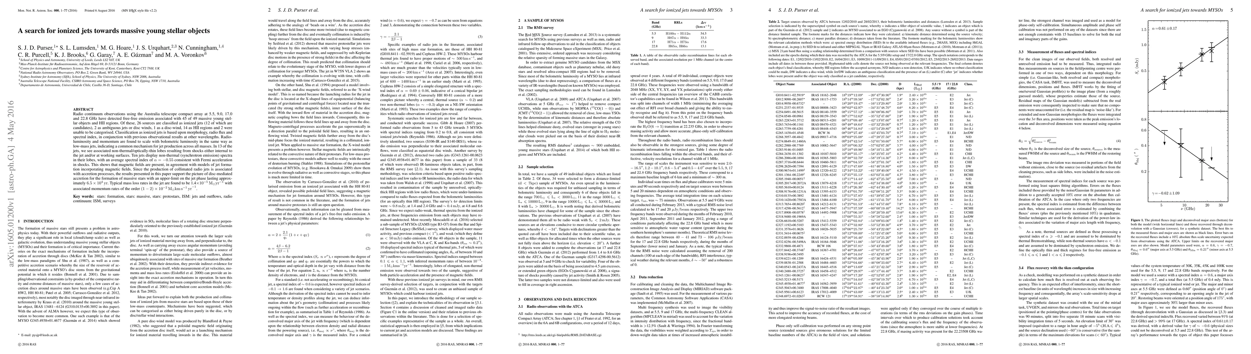 Radio continuum observations using the Australia telescope compact array at 5.5, 9.0, 17.0 and 22.8 GHz have detected free-free emission associated with 45 of 49 massive young stellar objects and HII regions. Of these, 26 sources are classified as ionized jets (12 of which are candidates), 2 as ambiguous jets or disc winds, 1 as a disc-wind, 14 as HII regions and 2 were unable to be categorised. Classification as ionized jets is based upon morphology, radio flux and spectral index, in conjunction with previous observational results at other wavelengths. Radio-luminosity and momentum are found to scale with bolometric luminosity in the same way as low-mass jets, indicating a common mechanism for jet production across all masses. In 13 of the jets, we see associated non-thermal/optically-thin lobes resulting from shocks either internal to the jet and/or at working surfaces. Ten jets display non-thermal (synchrotron emission) spectra in their lobes, with an average spectral index of -0.55 consistent with Fermi acceleration in shocks. This shows that magnetic fields are present, in agreement with models of jet formation incorporating magnetic fields. Since the production of collimated radio jets is associated with accretion processes, the results presented in this paper support the picture of disc-mediated accretion for the formation of massive stars with an upper-limit on the jet phase lasting approximately $6.5 \times 10^4 yr$. Typical mass loss rates in the jet are found to be $1.4 \times 10^{-5} M_\odot yr^{-1}$ with associated momentum rates of the order $(1-2) \times 10^{-2} M_\odot km s^{-1} yr^{-1}$.