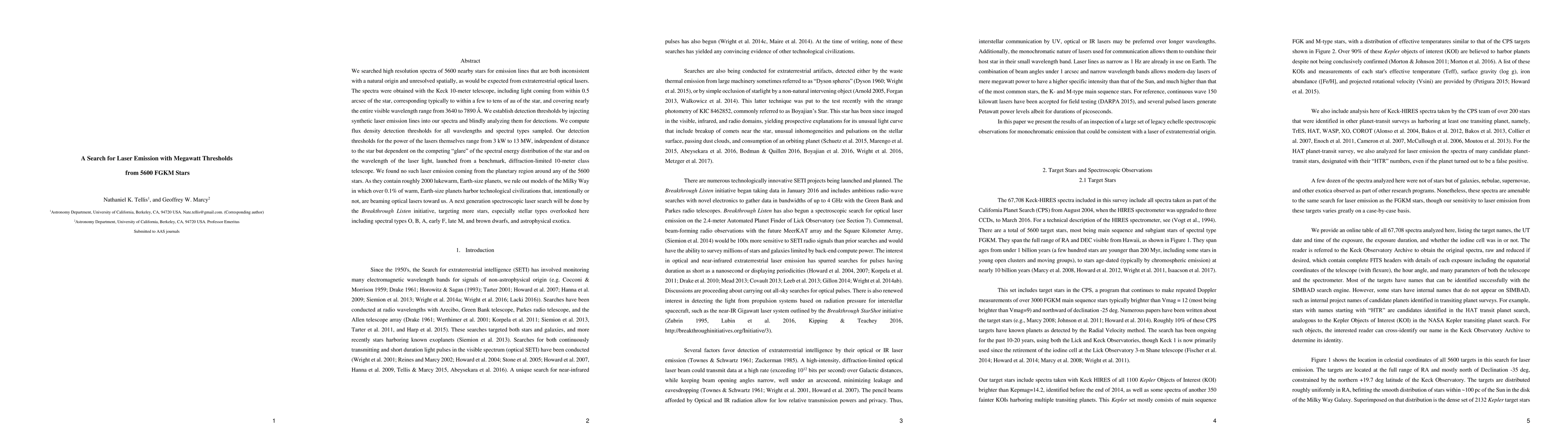 The research used the Keck 10-meter telescope to scrutinize spectra of 5600 nearby stars for artificial laser emissions. No such emissions were detected, implying that if technological civilizations exist on Earth-like planets around these stars, they aren't using optical lasers visible from Earth. The study sets power thresholds for detectable lasers ranging from 3 kW to 13 MW, dependent on stellar glare and laser wavelength. Future, more extensive laser searches targeting a broader range of stellar types are planned.