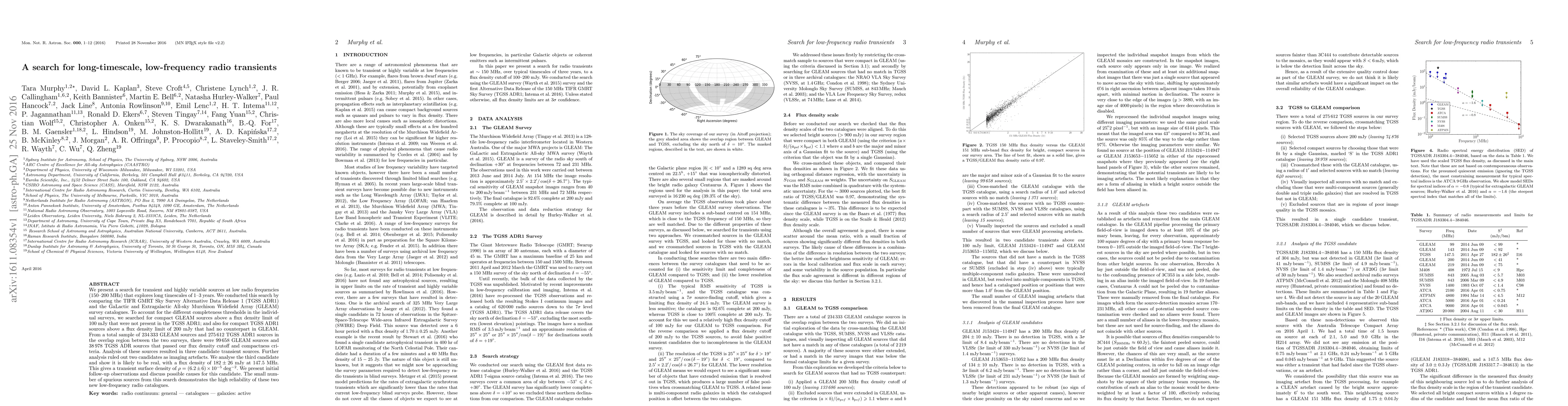 This research identifies transient radio sources at low frequencies (150-200 MHz) over long timescales (1-3 years) by comparing two radio surveys, finding three candidate transients, and confirming one as likely real with a transient surface density of 6.2 x 10^-5 deg^-2. The study highlights the reliability of the used radio catalogues.