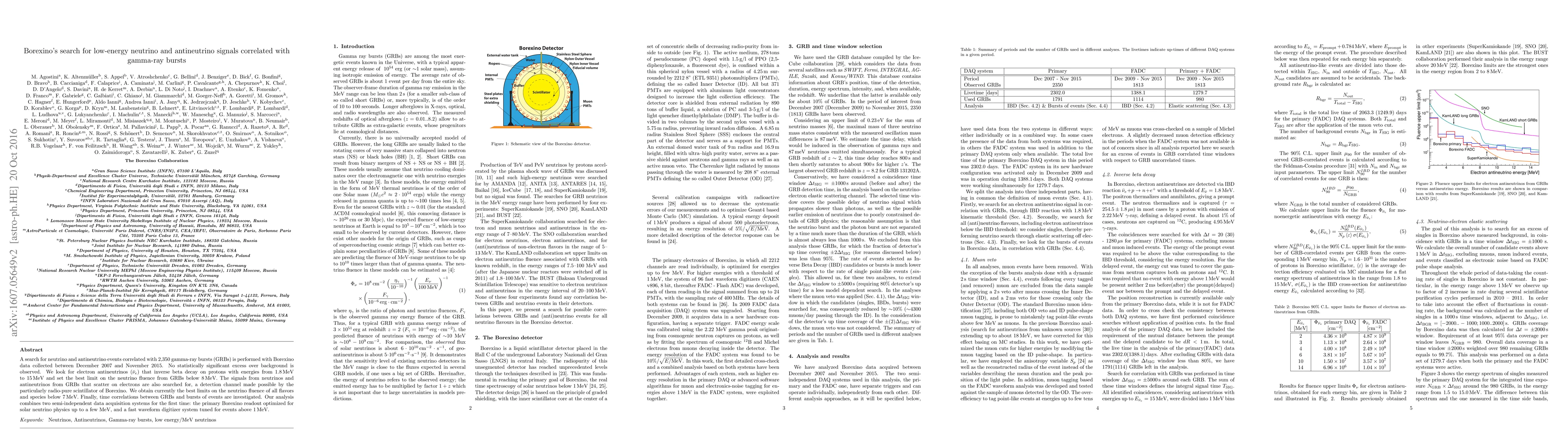 The Borexino experiment analyzed data from 2007-2015, searching for low-energy neutrino and antineutrino signals correlated with 2,350 gamma-ray bursts (GRBs). No significant excess over background was found, setting the best limits on neutrino fluence from GRBs below 8 MeV for all flavors and species. The study utilized two independent data acquisition systems for the first time.