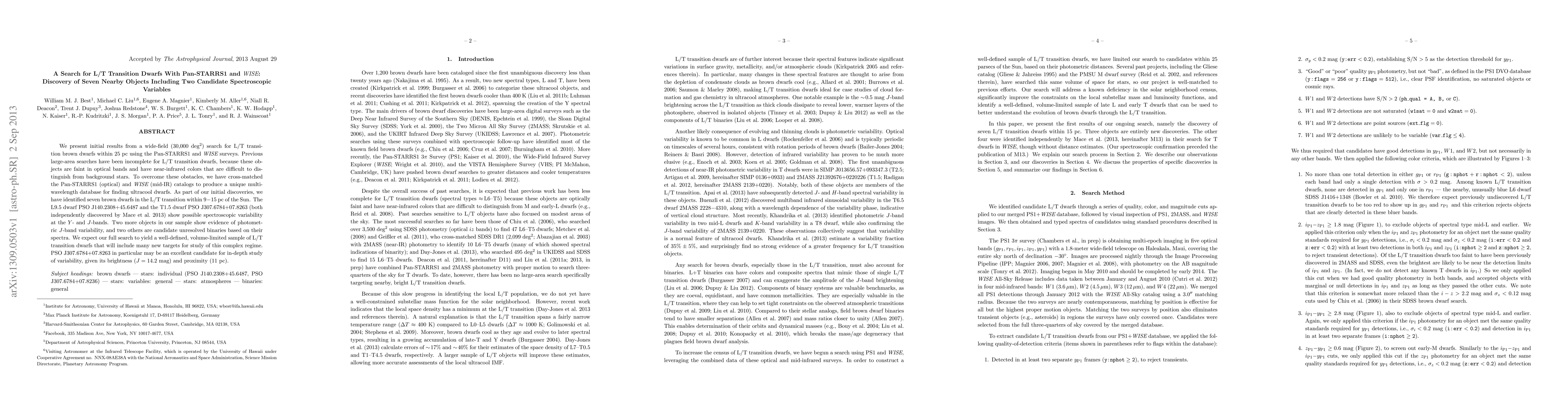 This research identifies seven nearby L/T transition brown dwarfs using Pan-STARRS1 and WISE surveys, overcoming previous search limitations. Among the discoveries, two candidates exhibit spectroscopic variability, highlighting potential for further study of these complex objects.
