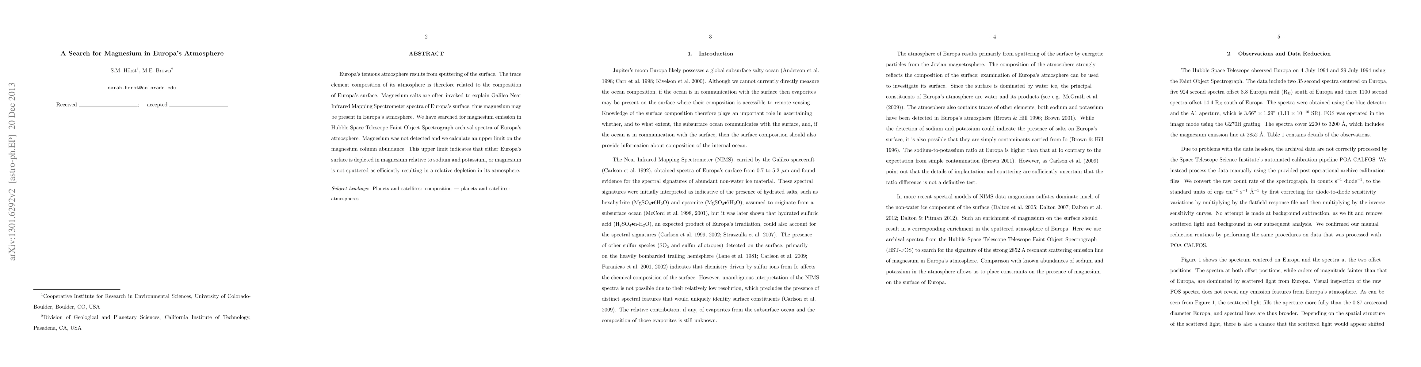 Europa's tenuous atmosphere results from sputtering of the surface. The trace element composition of its atmosphere is therefore related to the composition of Europa's surface. Magnesium salts are often invoked to explain Galileo Near Infrared Mapping Spectrometer spectra of Europa's surface, thus magnesium may be present in Europa's atmosphere. We have searched for magnesium emission in Hubble Space Telescope Faint Object Spectrograph archival spectra of Europa's atmosphere. Magnesium was not detected and we calculate an upper limit on the magnesium column abundance. This upper limit indicates that either Europa's surface is depleted in magnesium relative to sodium and potassium, or magnesium is not sputtered as efficiently resulting in a relative depletion in its atmosphere.