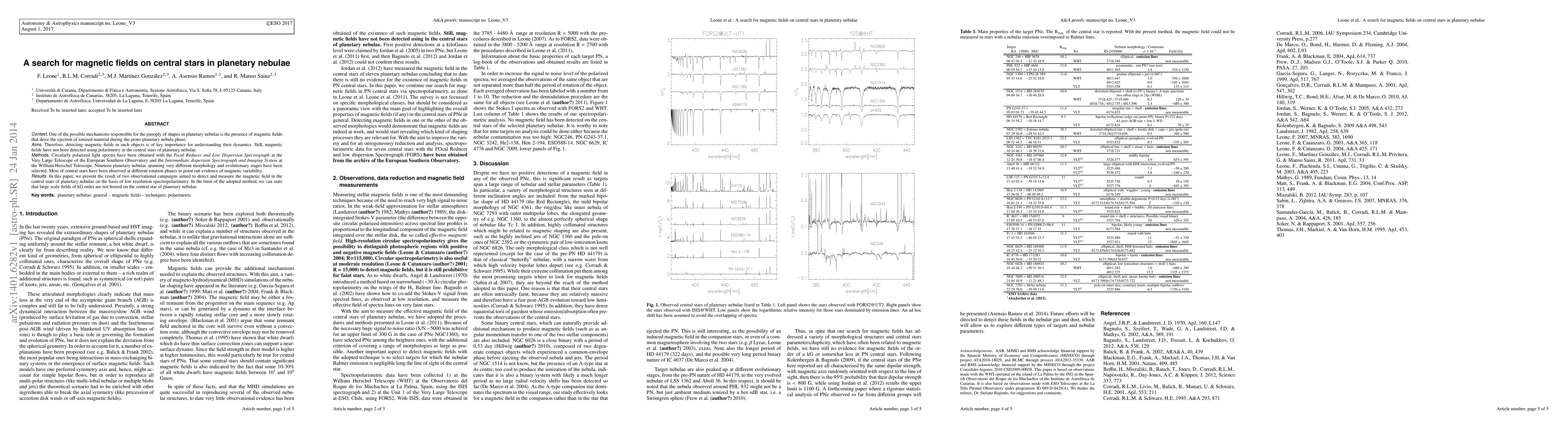 This research investigates the presence of magnetic fields in central stars of planetary nebulae using low resolution spectropolarimetry. Despite observing 19 nebulae at different evolutionary stages, no large-scale magnetic fields of kG order were detected.
