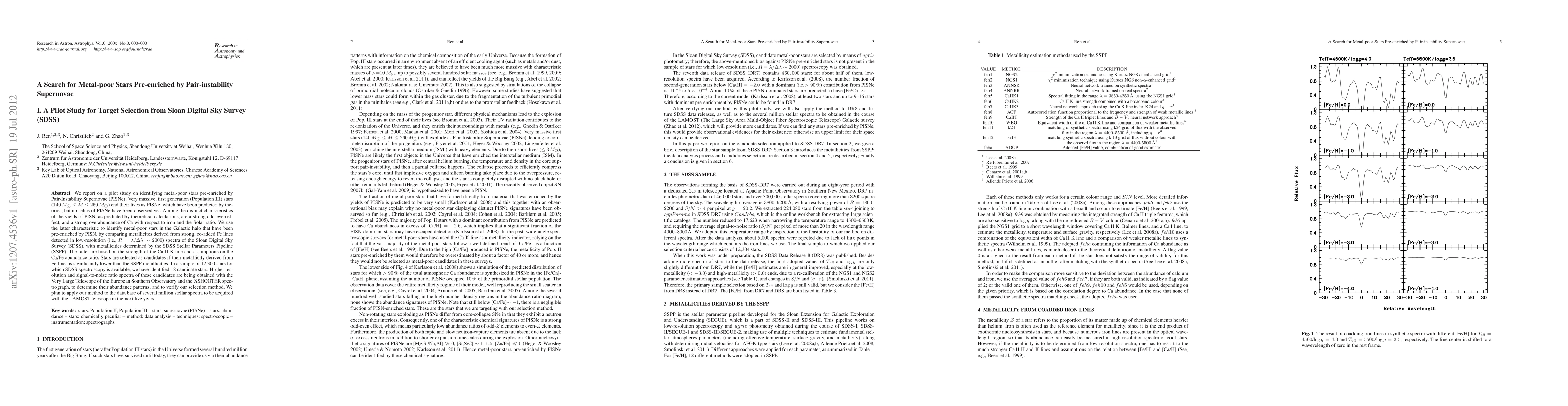 We report on a pilot study on identifying metal-poor stars pre-enriched by Pair-Instability Supernovae (PISNe). Very massive, first generation (Population III) stars (140M\odot \leq M \leq 260M\odot) end their lives as PISNe, which have been predicted by theories, but no relics of PISNe have been observed yet. Among the distinct characteristics of the yields of PISN, as predicted by theoretical calculations, are a strong odd-even effect, and a strong overabundance of Ca with respect to iron and the Solar ratio. We use the latter characteristic to identify metal-poor stars in the Galactic halo that have been pre-enriched by PISN, by comparing metallicites derived from strong, co-added Fe lines detected in low-resolution (i.e., R \sim 2000) spectra of the Sloan Digital Sky Survey (SDSS), with metallicities determined by the SDSS Stellar Parameters Pipeline (SSPP). The latter are based on the strength of the Ca II K line and assumptions on the Ca/Fe abundance ratio. Stars are selected as candidates if their metallicity derived from Fe lines is significantly lower than the SSPP metallicities. In a sample of 12,300 stars for which SDSS spectroscopy is available, we have identified 18 candidate stars. Higher resolution and signal-to-noise ratio spectra of these candidates are being obtained with the Very Large Telescope of the European Southern Observatory and the XSHOOTER spectrograph, to determine their abundance patterns, and to verify our selection method. We plan to apply our method to the data base of several million stellar spectra to be acquired with the LAMOST telescope in the next five years.