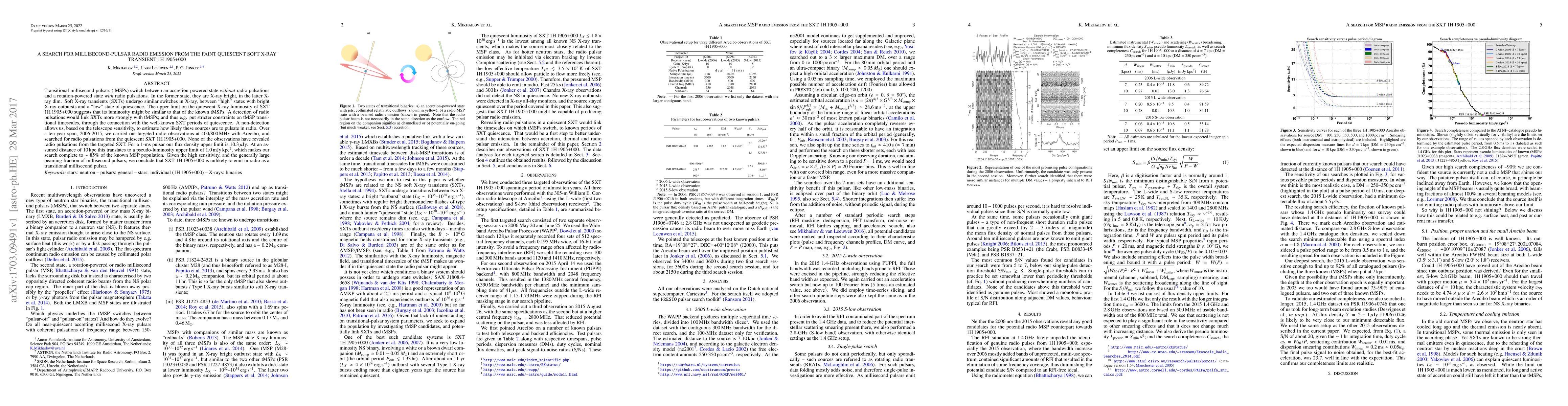 This study searched for radio emissions from the quiescent soft X-ray transient 1H 1905+000 over a decade using Arecibo, but found no radio pulsations. The absence of detectable radio signals suggests that 1H 1905+000 is unlikely to emit as a transitional millisecond pulsar.