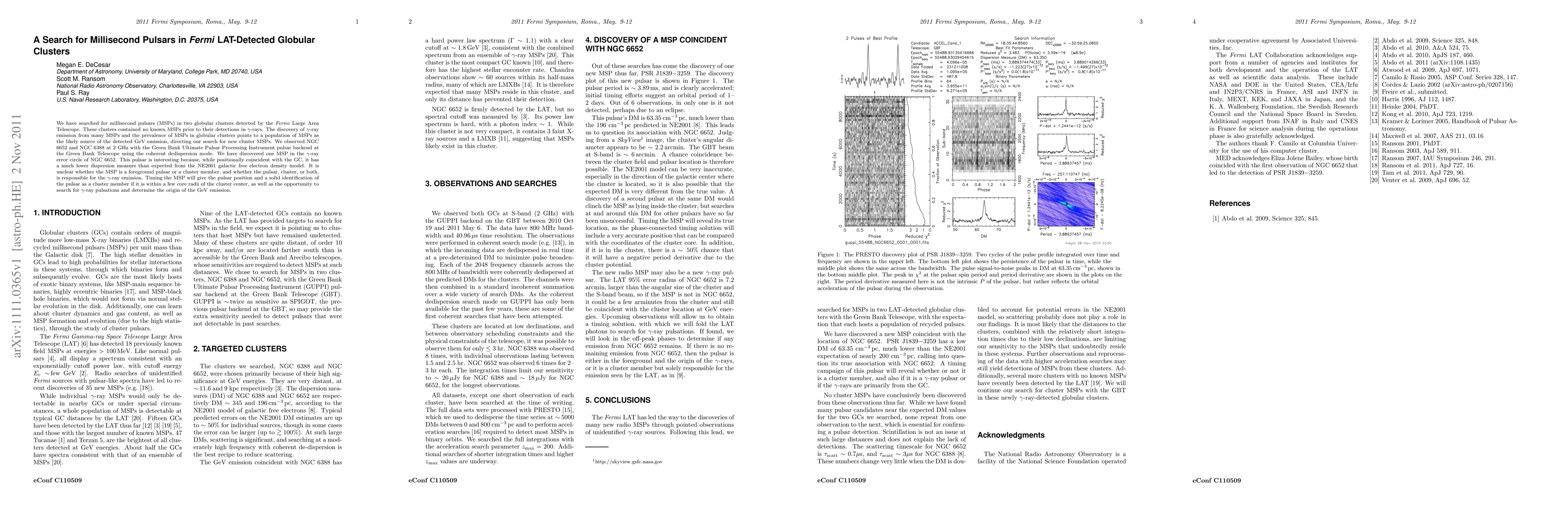 This paper reports the discovery of a millisecond pulsar (MSP) in the globular cluster NGC 6652, detected via gamma rays by the Fermi Large Area Telescope. The pulsar's low dispersion measure raises questions about its origin, potentially as a foreground object or a cluster member, and its role in the observed gamma ray emission.