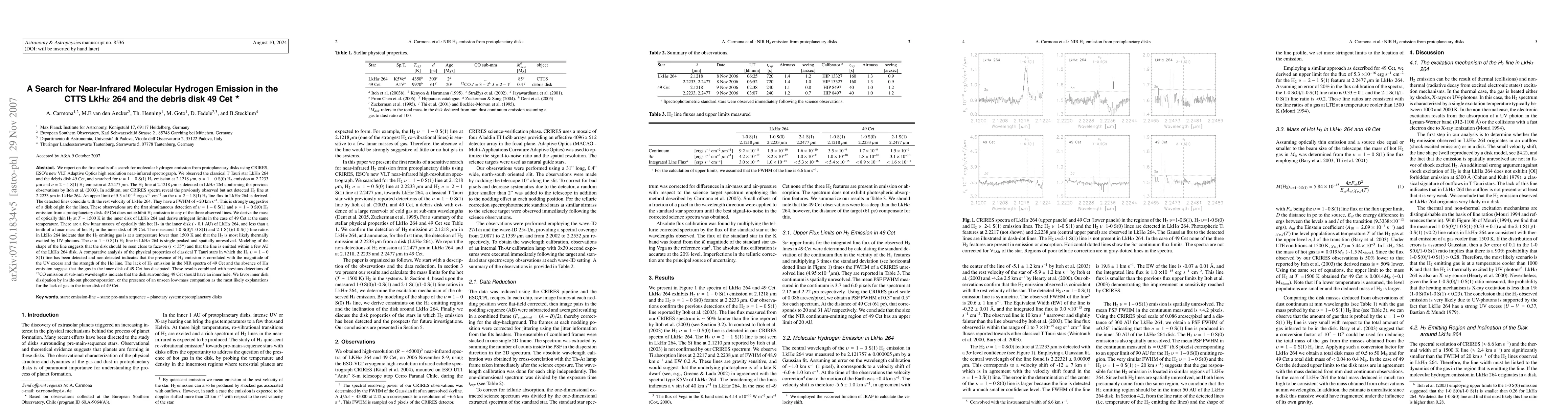 This study uses the CRIRES spectrograph on the VLT to detect H2 emission lines in the protoplanetary disk around LkHa 264 and finds no such emission in the debris disk of 49 Cet. The findings suggest that H2 emission correlates with UV excess and Hα strength, and the lack of such emission in 49 Cet indicates gas dissipation and an inner disk hole.