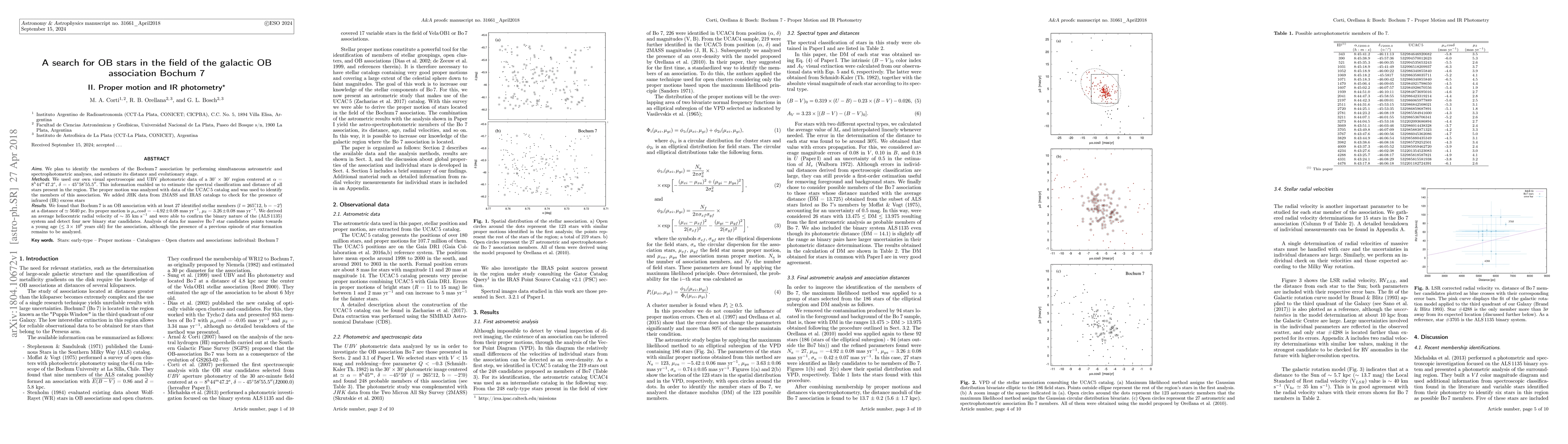 AIMS We plan to identify the members of the Bochum7 association by performing simultaneous astrometric and spectrophotometric analyses, and estimate its distance and evolutionary stage. METHODS. We used our own visual spectroscopic and UBV photometric data of a 30' x 30' region centered at R.A. = 8h44m47.2s, Decl = - 45d58m55.5s. This information enabled us to estimate the spectral classification and distance of all stars present in the region. The proper motion was analyzed with data of the UCAC5 catalog and was used to identify the members of this association. We added JHK data from 2MASS and IRAS catalogs to check for the presence of infrared (IR) excess stars. RESULTS. We found that Bochum7 is an OB association with at least 27 identified stellar members (l = 265.12d, b = -2.0d) at a distance of 5640 pc. Its proper motion is mu(alfa)cos(delta) = -4.92+-0.08 mas/yr, mu(delta) = 3.26+-0.08 mas/yr. We derived an average heliocentric radial velocity of 35 km/s and were able to confirm the binary nature of the (ALS 1135) system and detect four new binary star candidates. Analysis of data for massive Bo 7 star candidates points towards a young age (< 3x10^6 years old) for the association, although the presence of a previous episode of star formation remains to be analyzed.