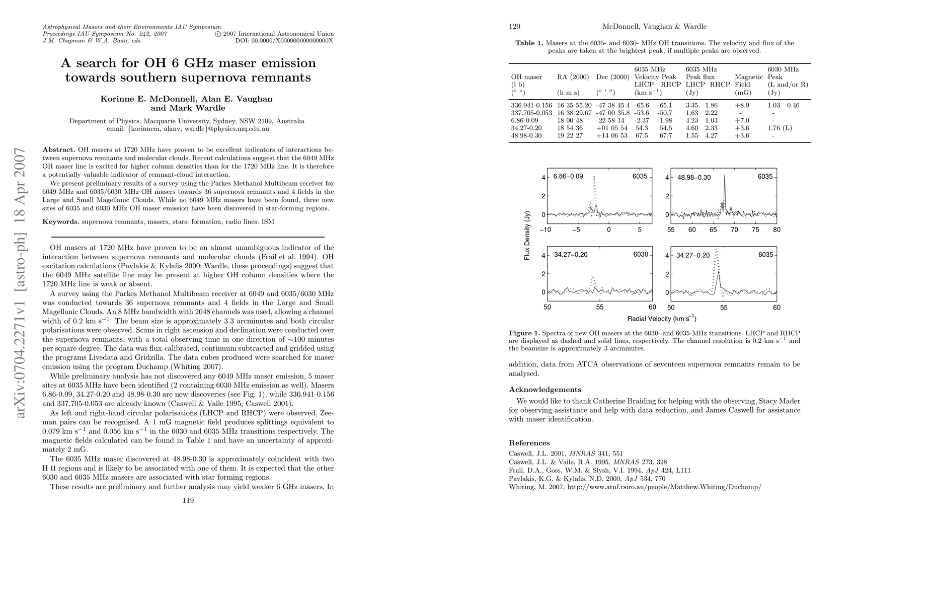 This paper reports on a survey for OH maser emissions at 6 GHz towards southern supernova remnants, finding no evidence of the 6049 MHz line but discovering three new sites of 6035 and 6030 MHz OH maser emissions in star-forming regions. The study highlights the potential of higher frequency OH masers to indicate interactions between supernova remnants and molecular clouds.