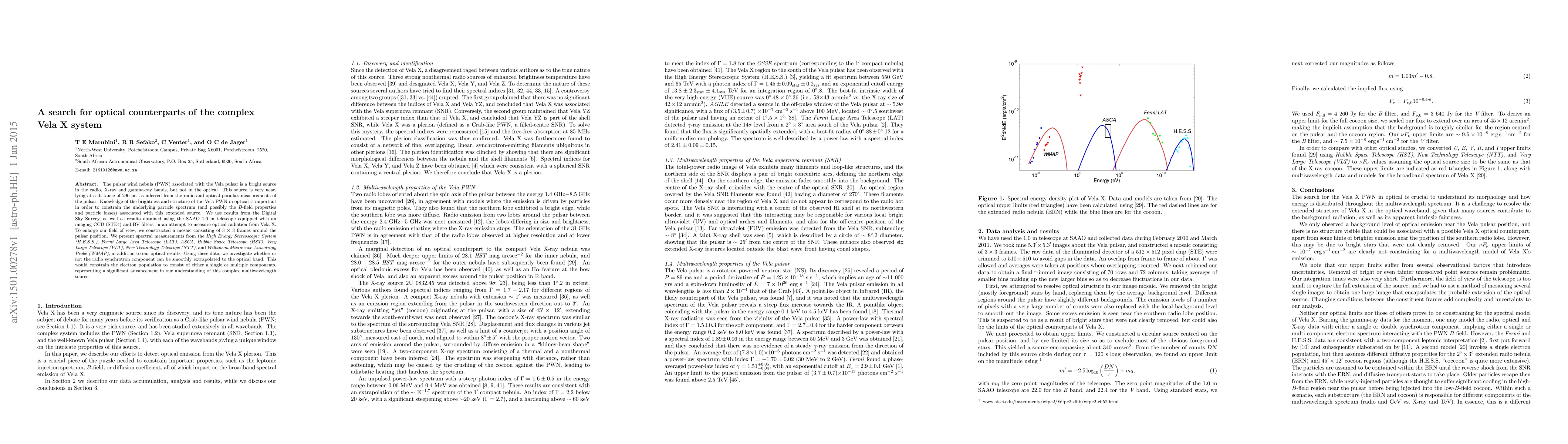 The pulsar wind nebula (PWN) associated with the Vela pulsar is a bright source in the radio, X-ray and gamma-ray bands, but not in the optical. This source is very near, lying at a distance of 290 pc, as inferred from the radio and optical parallax measurements of the pulsar. Knowledge of the brightness and structure of the Vela PWN in optical is important in order to constrain the underlying particle spectrum (and possibly the B-field properties and particle losses) associated with this extended source. We use results from the Digital Sky Survey, as well as results obtained using the SAAO 1.0 m telescope equipped with an imaging CCD (STE4) and BV filters, in an attempt to measure optical radiation from Vela X. To enlarge our field of view, we constructed a mosaic consisting of 3 x 3 frames around the pulsar position. We present spectral measurements from the High Energy Stereoscopic System (H.E.S.S.), Fermi Large Area Telescope (LAT), ASCA, Hubble Space Telescope (HST), Very Large Telescope (VLT), New Technology Telescope (NTT), and Wilkinson Microwave Anisotropy Probe (WMAP), in addition to our optical results. Using these data, we investigate whether or not the radio synchrotron component can be smoothly extrapolated to the optical band. This would constrain the electron population to consist of either a single or multiple components, representing a significant advancement in our understanding of this complex multiwavelength source.
