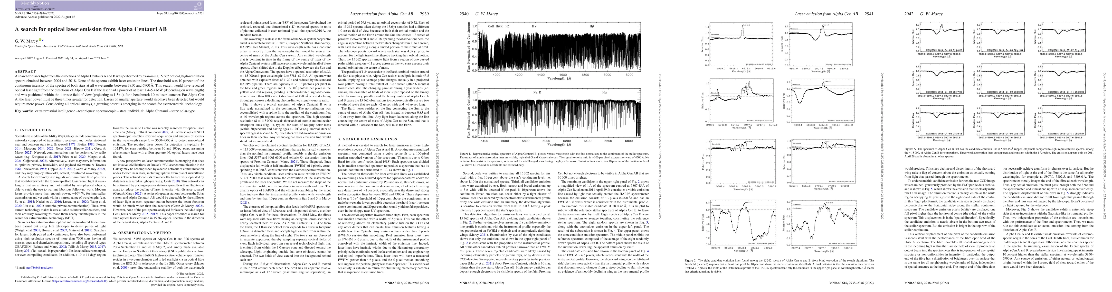 This study investigates optical laser emissions from Alpha Centauri AB using high-resolution spectra from 2004 to 2018, finding no evidence of laser light. The search sets limits on detectable laser power, indicating a growing lack of evidence for extraterrestrial technology.
