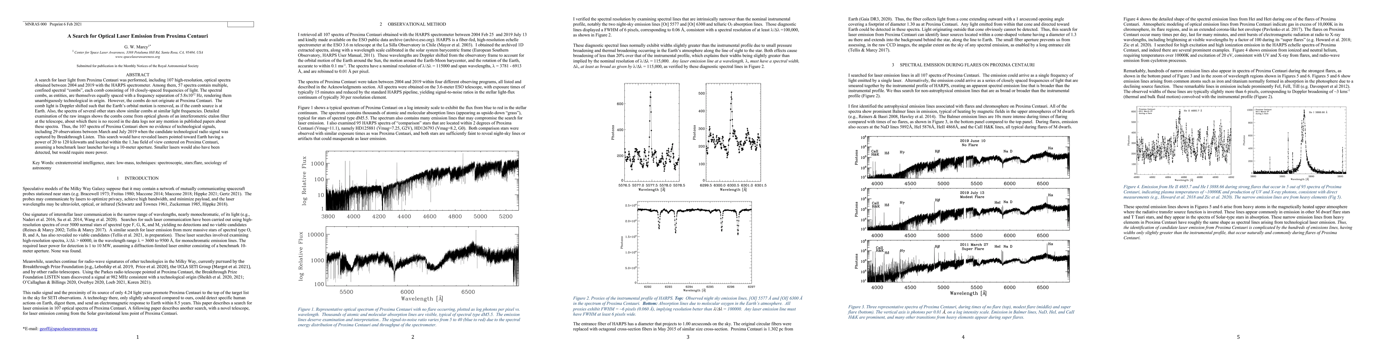This study analyzed 107 high-resolution optical spectra of Proxima Centauri obtained between 2004 and 2019 using the HARPS spectrometer, searching for laser emissions or other technological signals.