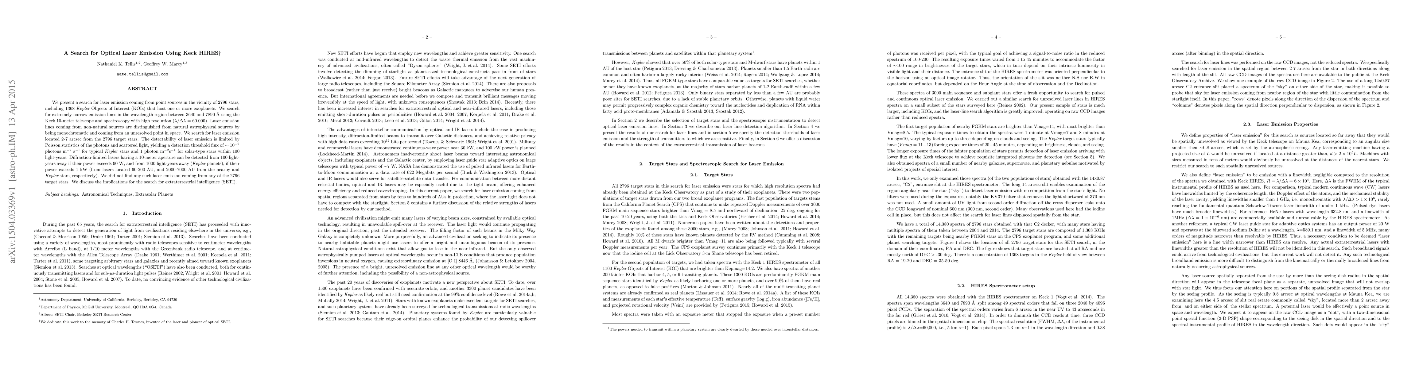 We present a search for laser emission coming from point sources in the vicinity of 2796 stars, including 1368 Kepler Objects of Interest (KOIs) that host one or more exoplanets. We search for extremely narrow emission lines in the wavelength region between 3640 and 7890 Angstroms using the Keck 10-meter telescope and spectroscopy with high resolution ($\lambda/\Delta \lambda$ = 60,000). Laser emission lines coming from non-natural sources are distinguished from natural astrophysical sources by being monochromatic and coming from an unresolved point in space. We search for laser emission located 2-7 arcsec from the 2796 target stars. The detectability of laser emission is limited by Poisson statistics of the photons and scattered light, yielding a detection threshold flux of approximately $10^{-2}$ photons $m^{-2} s^{-1}$ for typical Kepler stars and 1 photon $m^{-2} s^{-1}$ for solar-type stars within 100 light-years. Diffraction-limited lasers having a 10-meter aperture can be detected from 100 light-years away if their power exceeds 90 W, and from 1000 light-years away (Kepler planets), if their power exceeds 1 kW (from lasers located 60-200 AU, and 2000-7000 AU from the nearby and Kepler stars, respectively). We did not find any such laser emission coming from any of the 2796 target stars. We discuss the implications for the search for extraterrestrial intelligence (SETI).