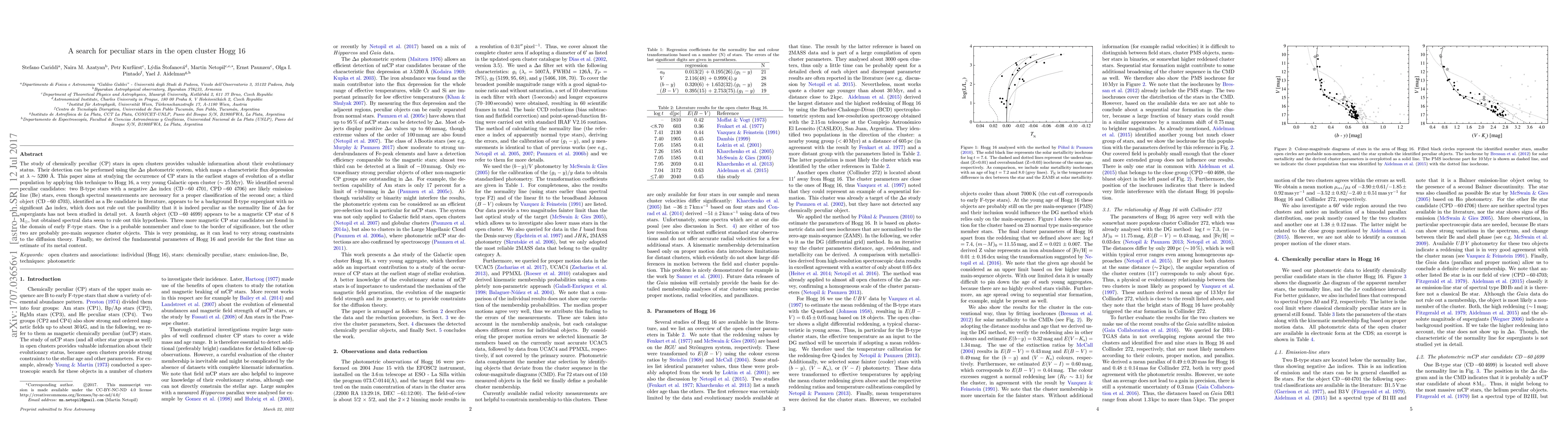 The study of chemically peculiar (CP) stars in open clusters provides valuable information about their evolutionary status. Their detection can be performed using the $\Delta a$ photometric system, which maps a characteristic flux depression at $\lambda \sim 5200$ \AA. This paper aims at studying the occurrence of CP stars in the earliest stages of evolution of a stellar population by applying this technique to Hogg 16, a very young Galactic open cluster (about 25 Myr). We identified several peculiar candidates: two B-type stars with a negative $\Delta a$ index (CD-60 4701, CPD-60 4706) are likely emission-line (Be) stars, even though spectral measurements are necessary for a proper classification of the second one; a third object (CD-60 4703), identified as a Be candidate in literature, appears to be a background B-type supergiant with no significant $\Delta a$ index, which does not rule out the possibility that it is indeed peculiar as the normality line of $\Delta a$ for supergiants has not been studied in detail yet. A fourth object (CD-60 4699) appears to be a magnetic CP star of 8 M$_\odot$, but obtained spectral data seem to rule out this hypothesis. Three more magnetic CP star candidates are found in the domain of early F-type stars. One is a probable nonmember and close to the border of significance, but the other two are probably pre-main sequence cluster objects. This is very promising, as it can lead to very strong constraints to the diffusion theory. Finally, we derived the fundamental parameters of Hogg 16 and provide for the first time an estimate of its metal content.
