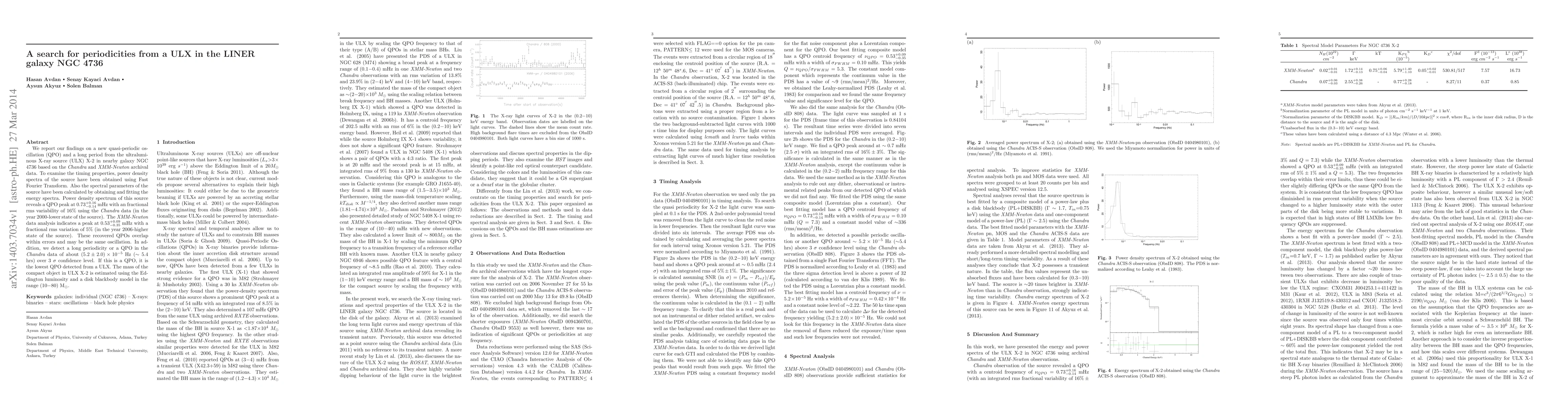The study detects a quasi-periodic oscillation (QPO) and a long periodicity in an ultraluminous X-ray source (ULX) in the galaxy NGC 4736, with estimated object mass between 10-80 solar masses.