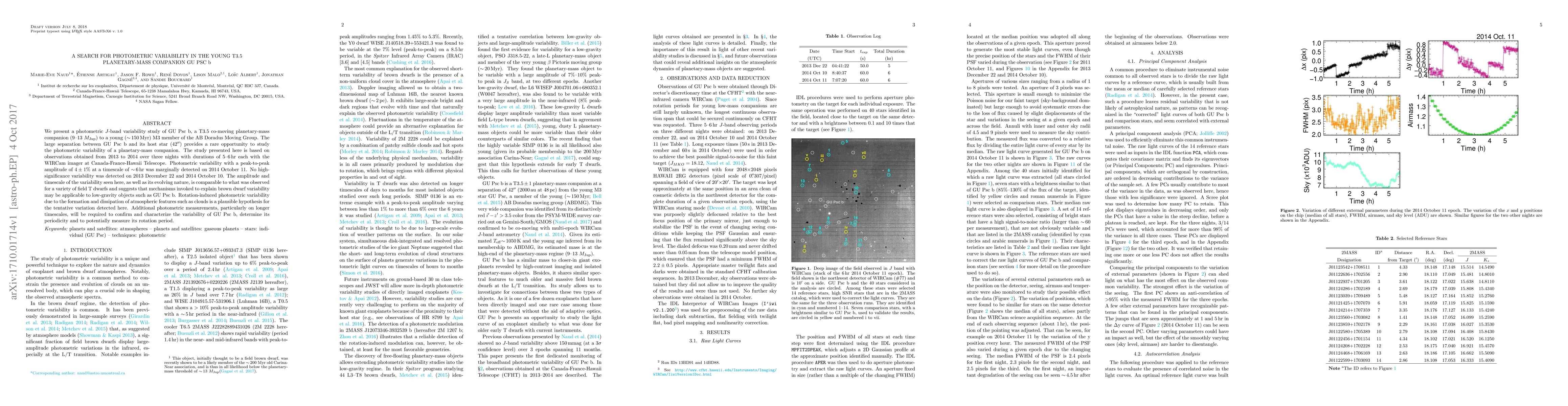 This study investigates photometric variability in the T3.5 planetary-mass companion GU Psc b using $J$-band observations over three nights in 2013-2014. Marginal variability with a peak-to-peak amplitude of $4\pm1$% was detected on one night, suggesting mechanisms similar to those in brown dwarfs may explain the variability.