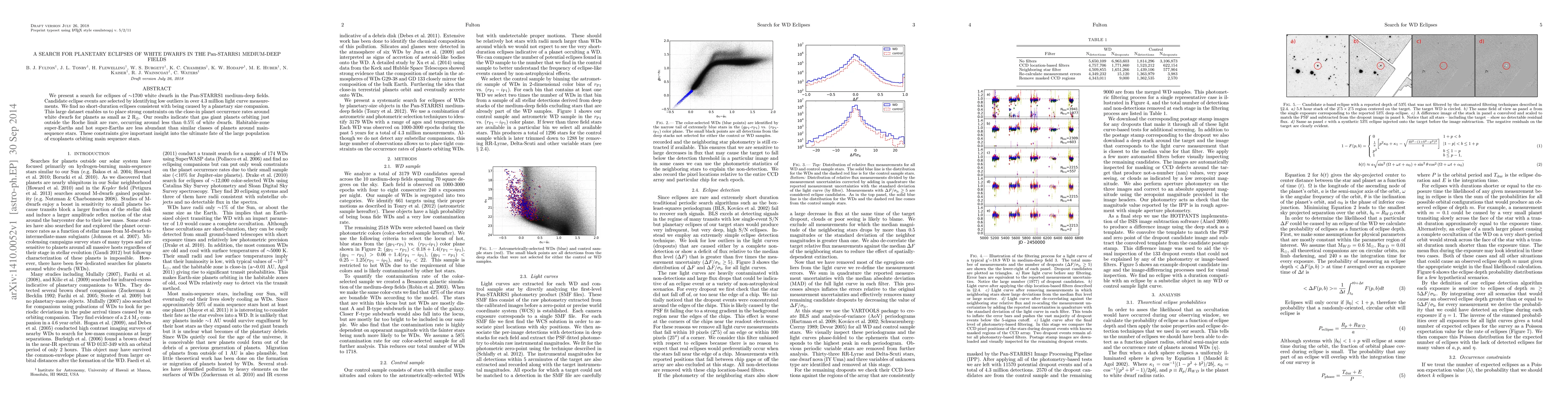 This study searched for planetary eclipses of approximately 1700 white dwarfs in the Pan-STARRS1 medium-deep fields, finding no evidence for short-duration eclipses from planetary companions. The results place strong constraints on the occurrence rates of close-in planets around white dwarfs, indicating that gas giant planets are rare, occurring in less than 0.5% of cases.