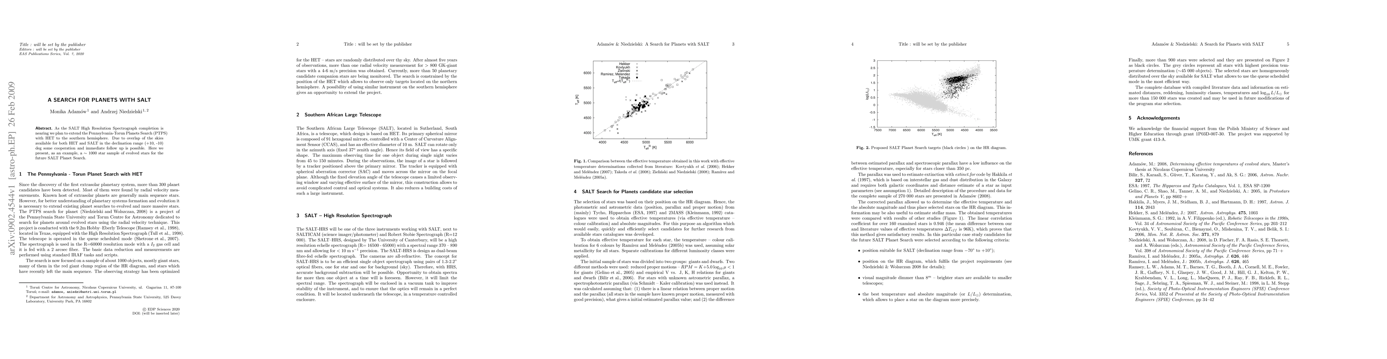 As the SALT High Resolution Spectrograph completion is nearing we plan to extend the Pennsylvania-Torun Planets Search (PTPS) with HET to the southern hemisphere. Due to overlap of the skies available for both HET and SALT in the declination range (+10, -10) deg some cooperation and immediate follow up is possible. Here we present, as an example, a $\sim$ 1000 star sample of evolved stars for the future SALT Planet Search.