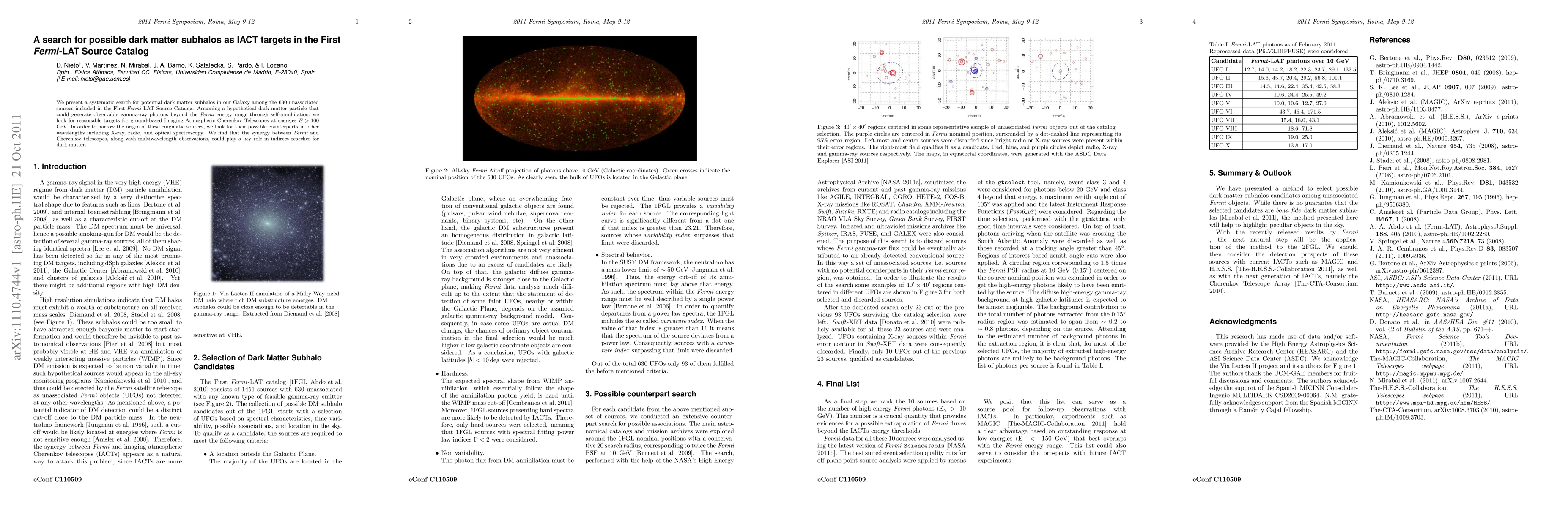 We present a systematic search for potential dark matter subhalos in our Galaxy among the 630 unassociated sources included in the First Fermi-LAT Source Catalog. Assuming a hypothetical dark matter particle that could generate observable gamma-ray photons beyond the Fermi energy range through self-annihilation, we look for reasonable targets for ground-based Imaging Atmospheric Cherenkov Telescopes at energies E > 100 GeV. In order to narrow the origin of these enigmatic sources, we look for their possible counterparts in other wavelengths including X-ray, radio, and optical spectroscopy. We find that the synergy between Fermi and Cherenkov telescopes, along with multiwavelength observations, could play a key role in indirect searches for dark matter.