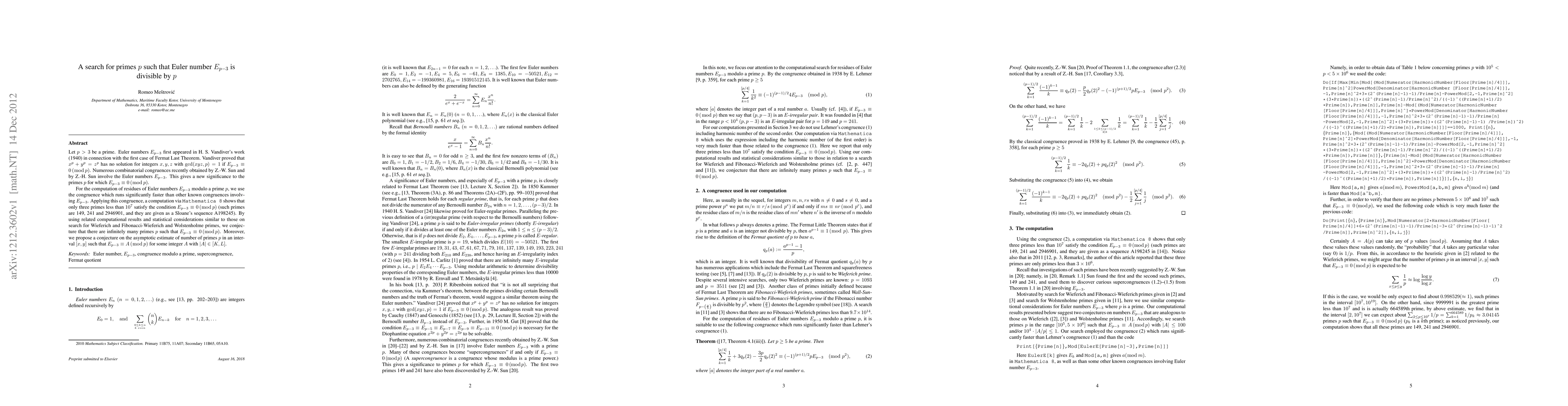 Let $p>3$ be a prime. Euler numbers $E_{p-3}$ first appeared in H. S. Vandiver's work (1940) in connection with the first case of Fermat Last Theorem. Vandiver proved that $x^p+y^p=z^p$ has no solution for integers $x,y,z$ with $\gcd(xyz,p)=1$ if $E_{p-3}\equiv 0 (\bmod p)$. Numerous combinatorial congruences recently obtained by Z.-W. Sun and by Z.-H. Sun involve the Euler numbers $E_{p-3}$. This gives a new significance to the primes $p$ for which $E_{p-3}\equiv 0 (\bmod p)$. For the computation of residues of Euler numbers $E_{p-3}$ modulo a prime $p$, we use the congruence which runs significantly faster than other known congruences involving $E_{p-3}$. Applying this congruence, a computation via {\tt Mathematica 8} shows that only three primes less than $10^7$ satisfy the condition $E_{p-3}\equiv 0 (\bmod p)$ (such primes are 149, 241 and 2946901, and they are given as a Sloane's sequence A198245). By using related computational results and statistical considerations similar to those on search for Wieferich and Fibonacci-Wieferich and Wolstenholme primes, we conjecture that there are infinitely many primes $p$ such that $E_{p-3}\equiv 0 (\bmod p)$. Moreover, we propose a conjecture on the asymptotic estimate of number of primes $p$ in an interval $[x,y]$ such that $E_{p-3}\equiv A (\bmod p)$ for some integer $A$ with $|A|\in [K,L]$.