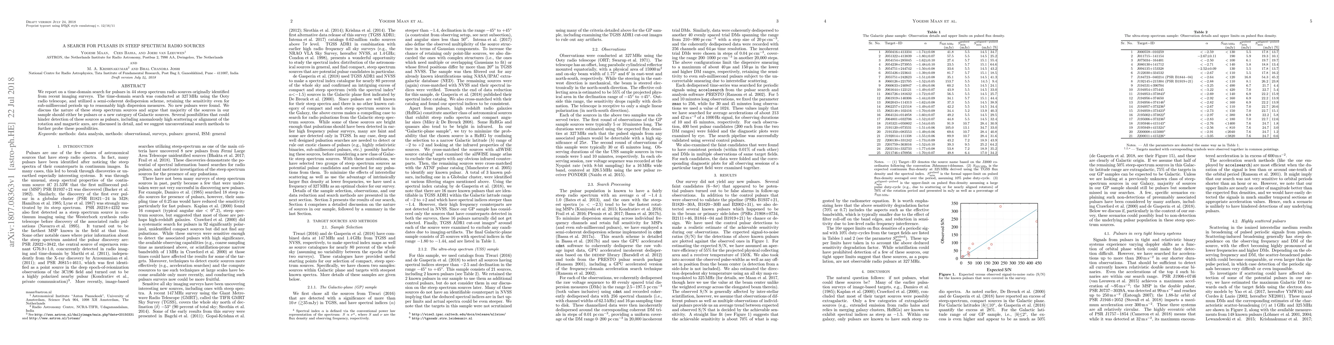 We report on a time-domain search for pulsars in 44 steep spectrum radio sources originally identified from recent imaging surveys. The time-domain search was conducted at 327 MHz using the Ooty radio telescope, and utilized a semi-coherent dedispersion scheme retaining the sensitivity even for sub-millisecond periods up to reasonably high dispersion measures. No new pulsars were found. We discuss the nature of these steep spectrum sources and argue that majority of the sources in our sample should either be pulsars or a new category of Galactic sources. Several possibilities that could hinder detection of these sources as pulsars, including anomalously high scattering or alignment of the rotation and magnetic axes, are discussed in detail, and we suggest unconventional search methods to further probe these possibilities.