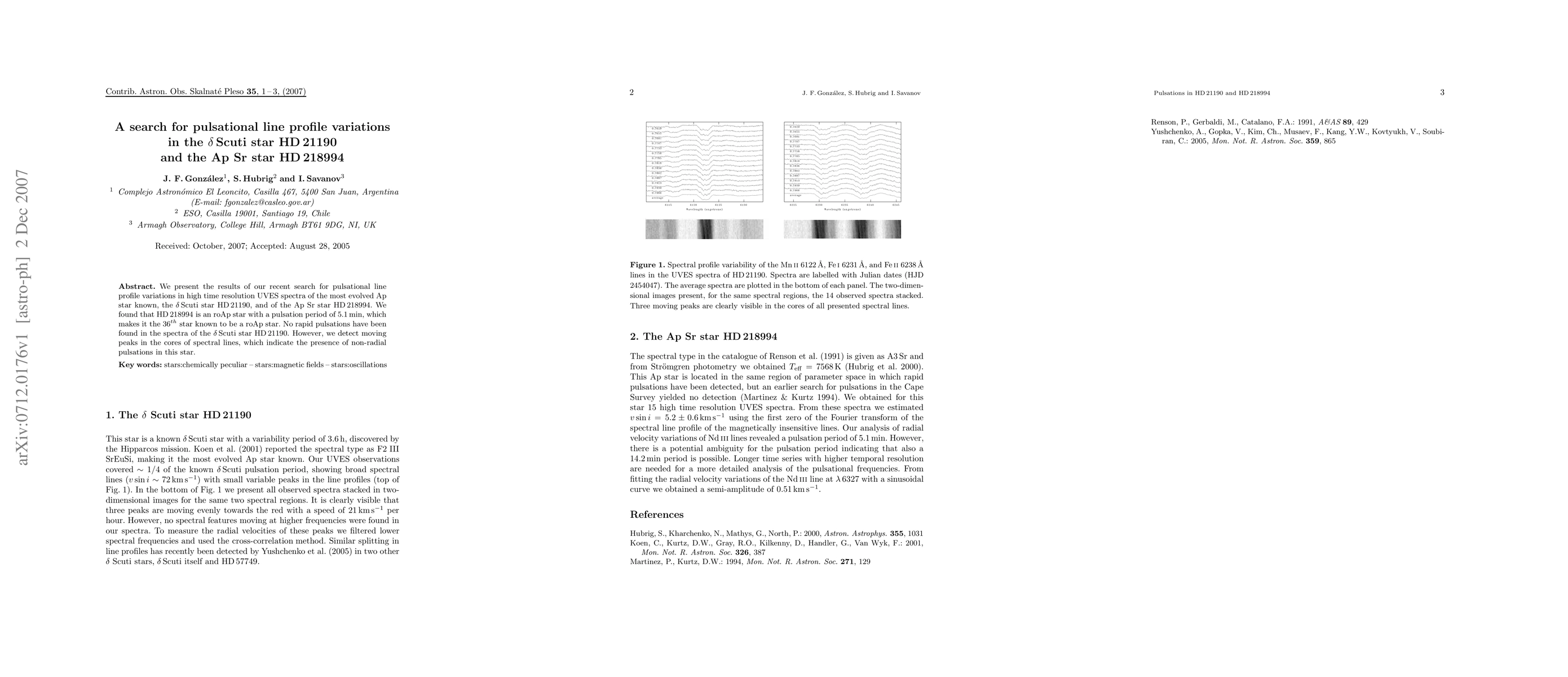We present the results of our recent search for pulsational line profile variations in high time resolution UVES spectra of the most evolved Ap star known, the delta Scuti star HD21190, and of the Ap Sr star HD218994. We found that HD218994 is an roAp star with a pulsation period of 5.1 min, which makes it the 36th star known to be a roAp star. No rapid pulsations have been found in the spectra of the delta Scuti star HD21190. However, we detect moving peaks in the cores of spectral lines, which indicate the presence of non-radial pulsations in this star.