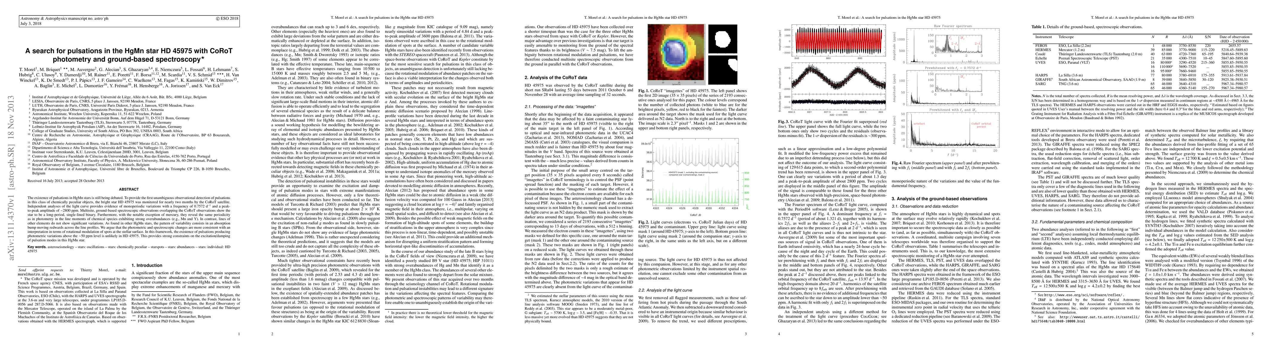 The CoRoT satellite and ground-based spectroscopy detected monoperiodic variations in the HgMn star HD 45975, suggesting rotational modulation of surface spots rather than pulsations. The observed variations are linked to overabundant elements like Mn and Y, indicating no significant pulsations above ~50 ppm.