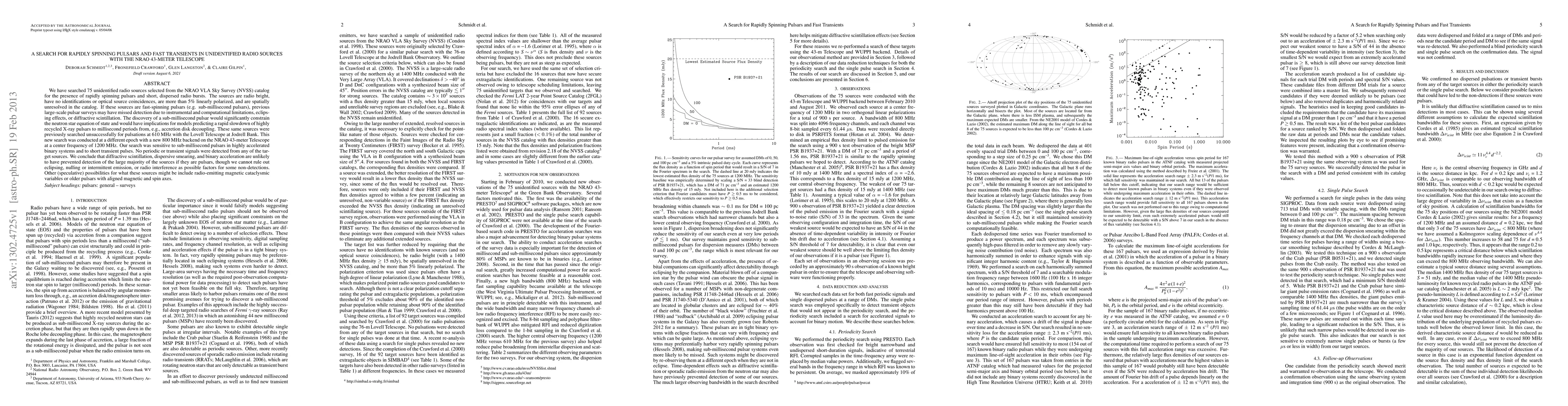 We have searched 75 unidentified radio sources selected from the NRAO VLA Sky Survey (NVSS) catalog for the presence of rapidly spinning pulsars and short, dispersed radio bursts. The sources are radio bright, have no identifications or optical source coincidences, are more than 5% linearly polarized, and are spatially unresolved in the catalog. If these sources are fast-spinning pulsars (e.g. sub-millisecond pulsars), previous large-scale pulsar surveys may have missed detection due to instrumental and computational limitations, eclipsing effects, or diffractive scintillation. The discovery of a sub-millisecond pulsar would significantly constrain the neutron star equation of state and would have implications for models predicting a rapid slowdown of highly recycled X-ray pulsars to millisecond periods from, e.g., accretion disk decoupling. These same sources were previously searched unsuccessfully for pulsations at 610 MHz with the Lovell Telescope at Jodrell Bank. This new search was conducted at a different epoch with a new 800 MHz backend on the NRAO 43-meter Telescope at a center frequency of 1200 MHz. Our search was sensitive to sub-millisecond pulsars in highly accelerated binary systems and to short transient pulses. No periodic or transient signals were detected from any of the target sources. We conclude that diffractive scintillation, dispersive smearing, and binary acceleration are unlikely to have prevented detection of the large majority of the sources if they are pulsars, though we cannot rule out eclipsing, nulling or intermittent emission, or radio interference as possible factors for some non-detections. Other (speculative) possibilities for what these sources might be include radio-emitting magnetic cataclysmic variables or older pulsars with aligned magnetic and spin axes.