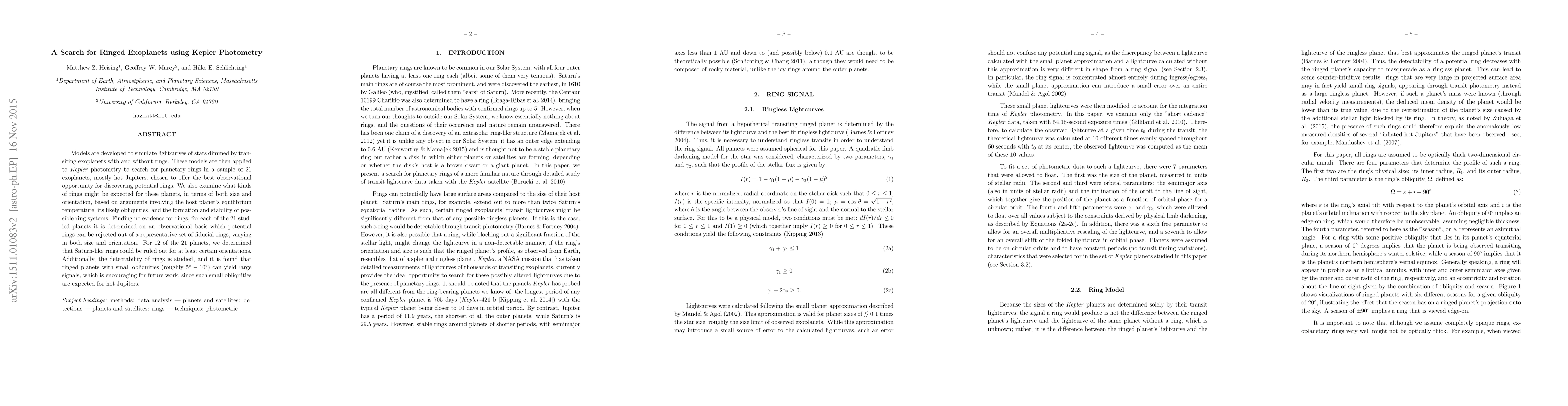 This study uses Kepler photometry to model and search for rings around 21 exoplanets, mostly hot Jupiters, finding no evidence for rings. It concludes that Saturn-like rings can be ruled out for certain orientations in 12 of the studied planets, while small obliquities in hot Jupiters may yield detectable ring signals in future observations.